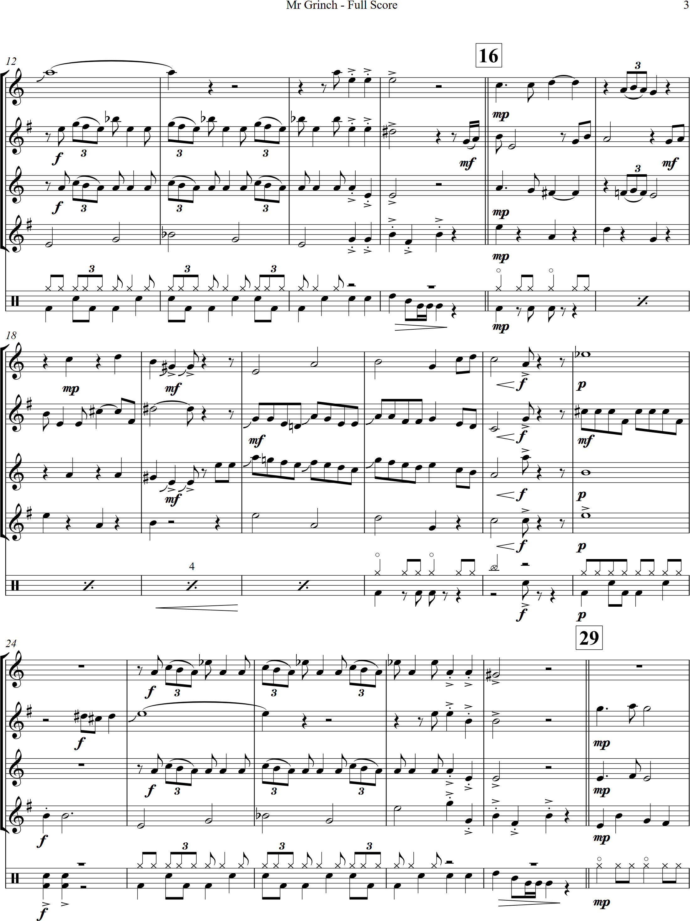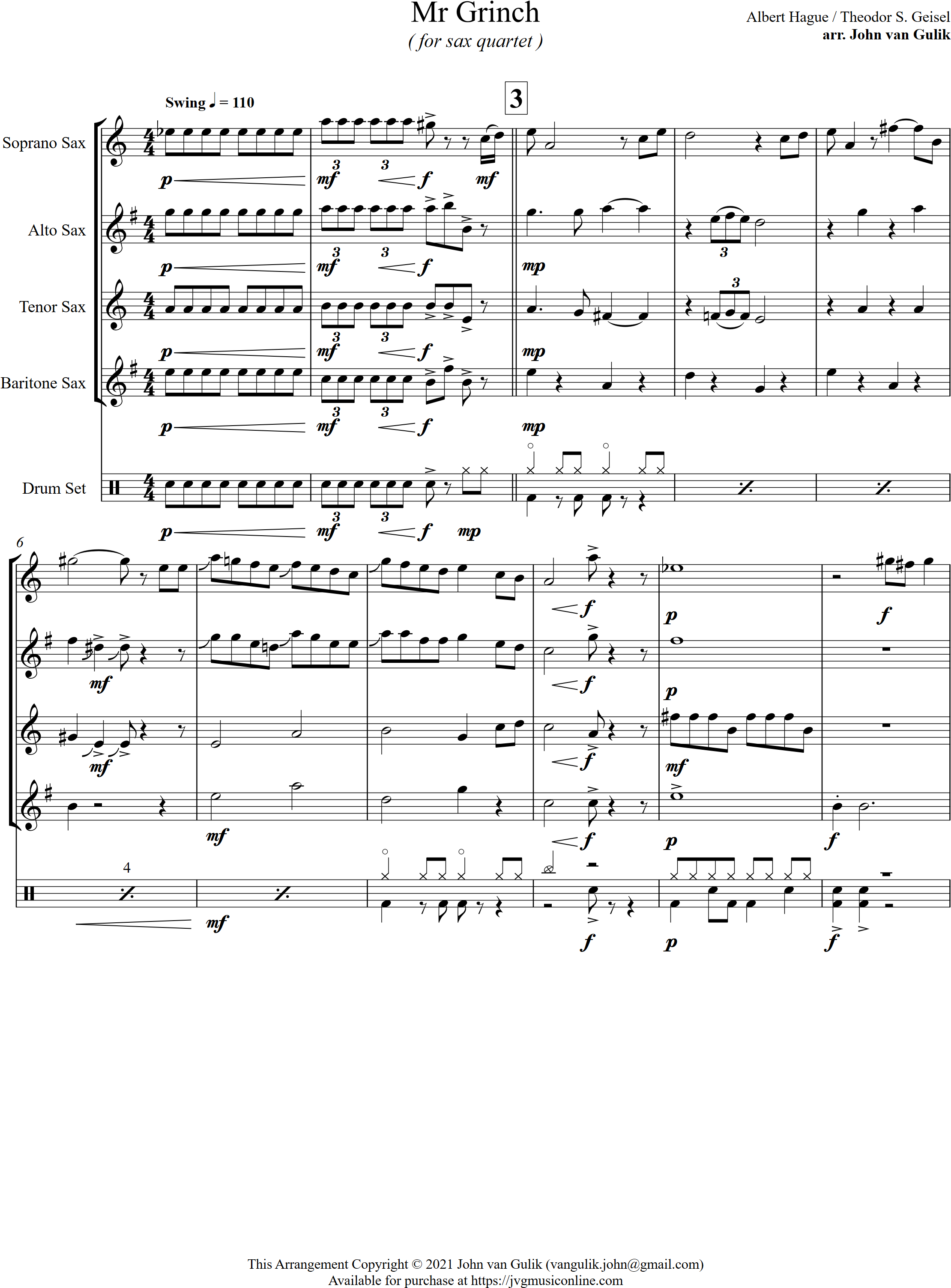 Mr Grinch | swing | Advanced | Bb | WATCH | You're a Mean One, Mr Grinch is sure to be a crowd pleaser in any Christmas concert. Arranged for 4 saxes and percussion, the melody moves around the 4 parts. | |||
