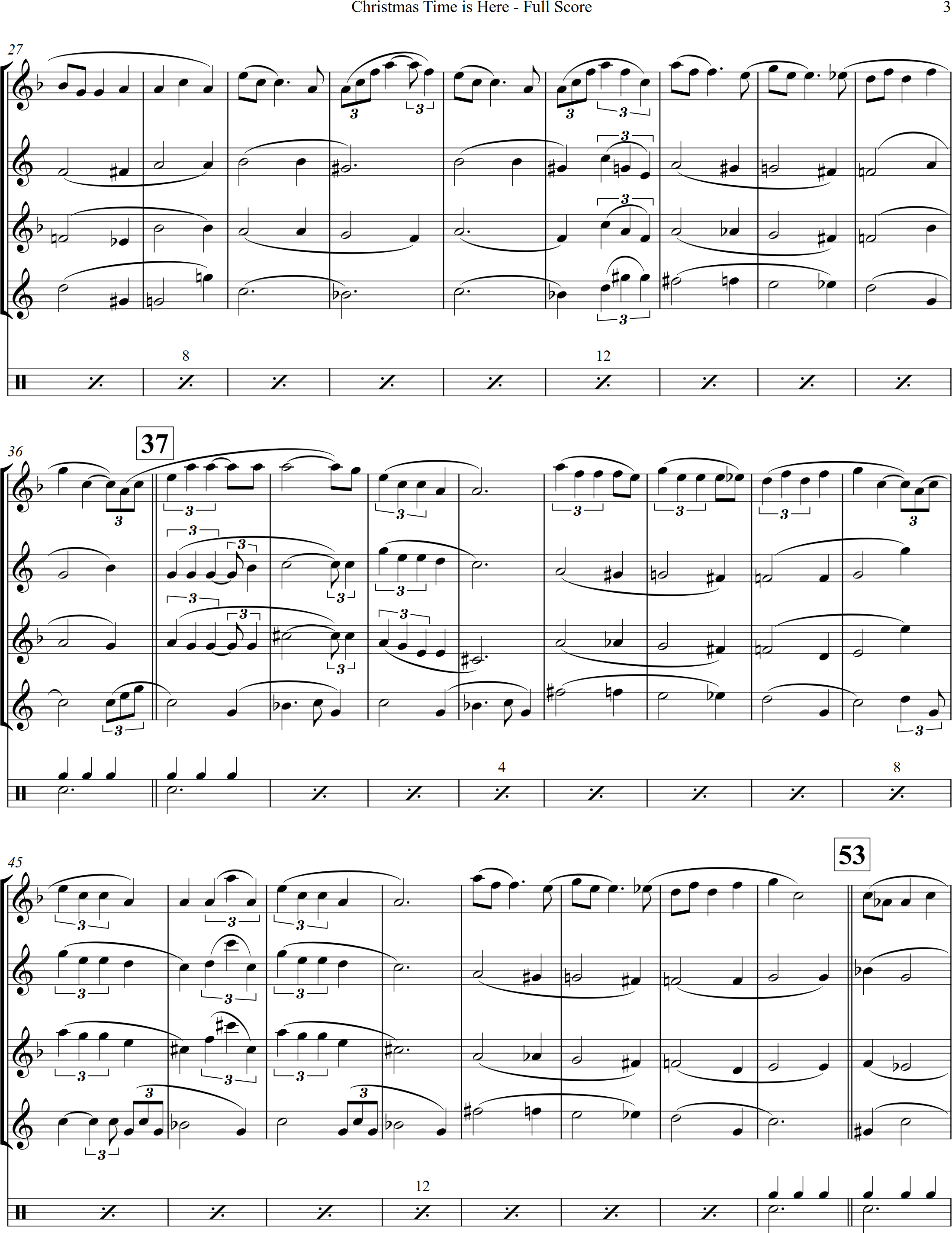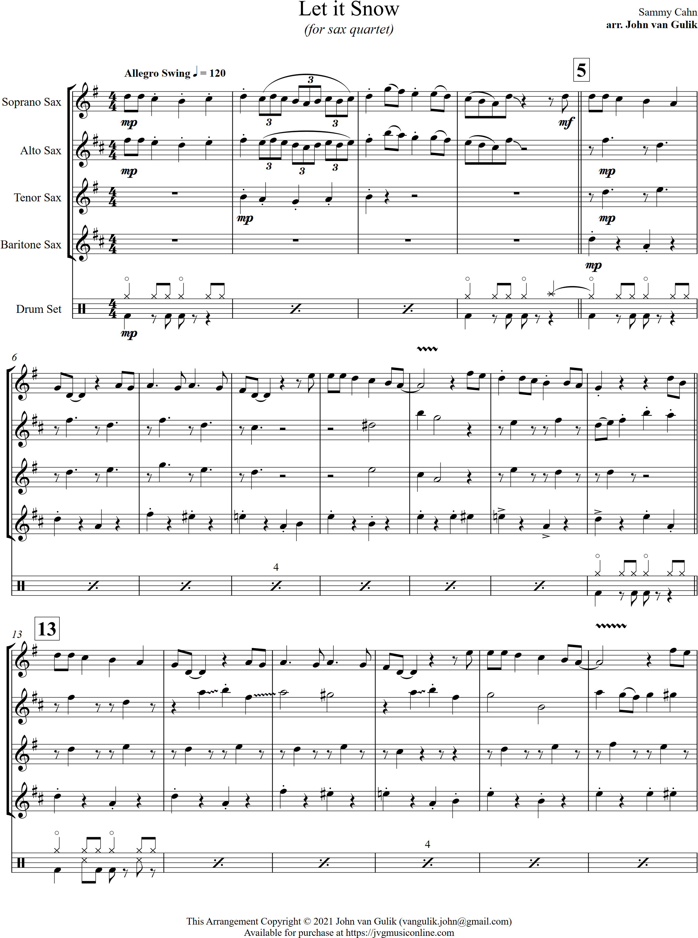 Let it Snow | swing | Intermediate | F/G | WATCH | Let it Snow is one of the most favourite Christmas songs, arranged here in a swing style for 4 saxes and percussion. | |||