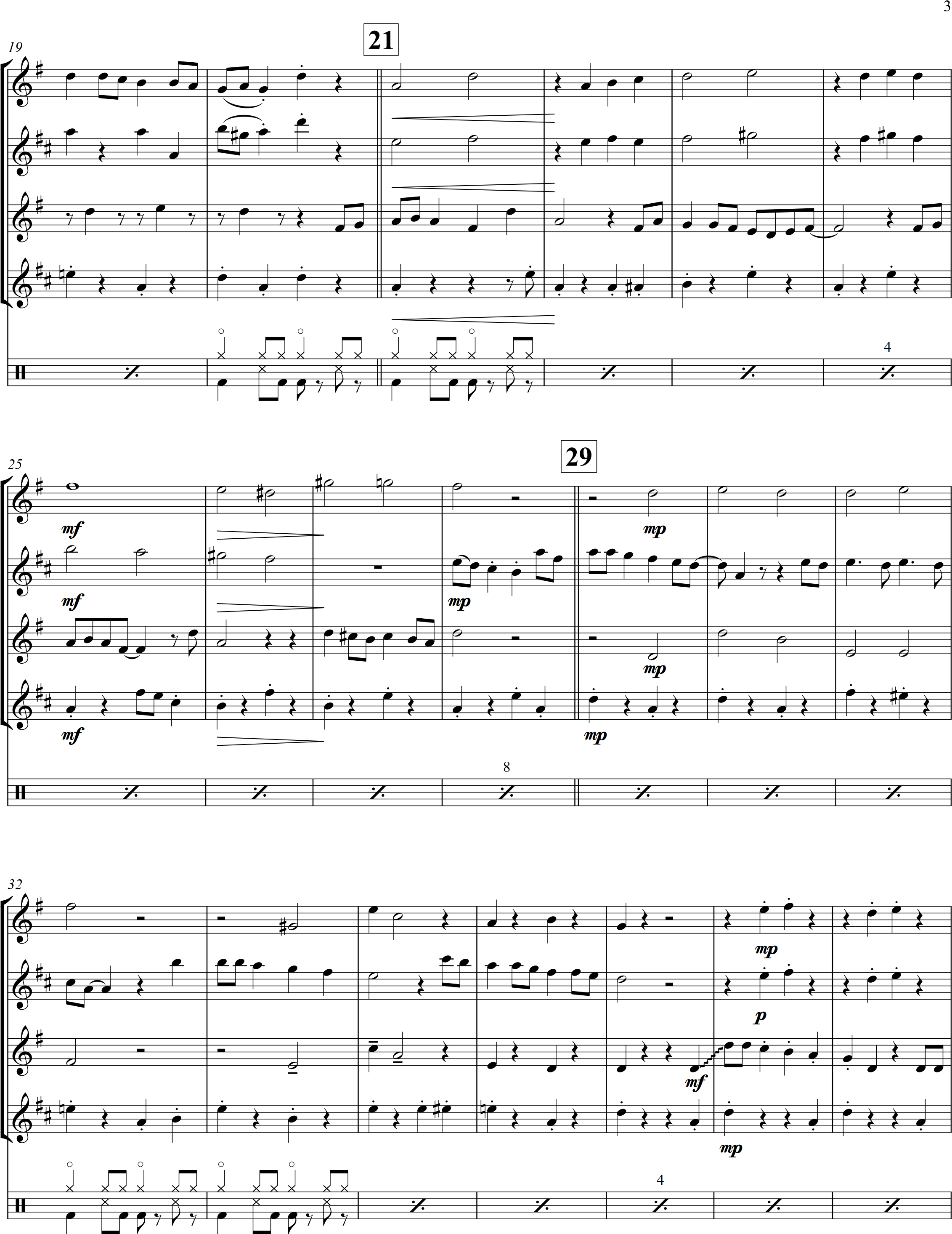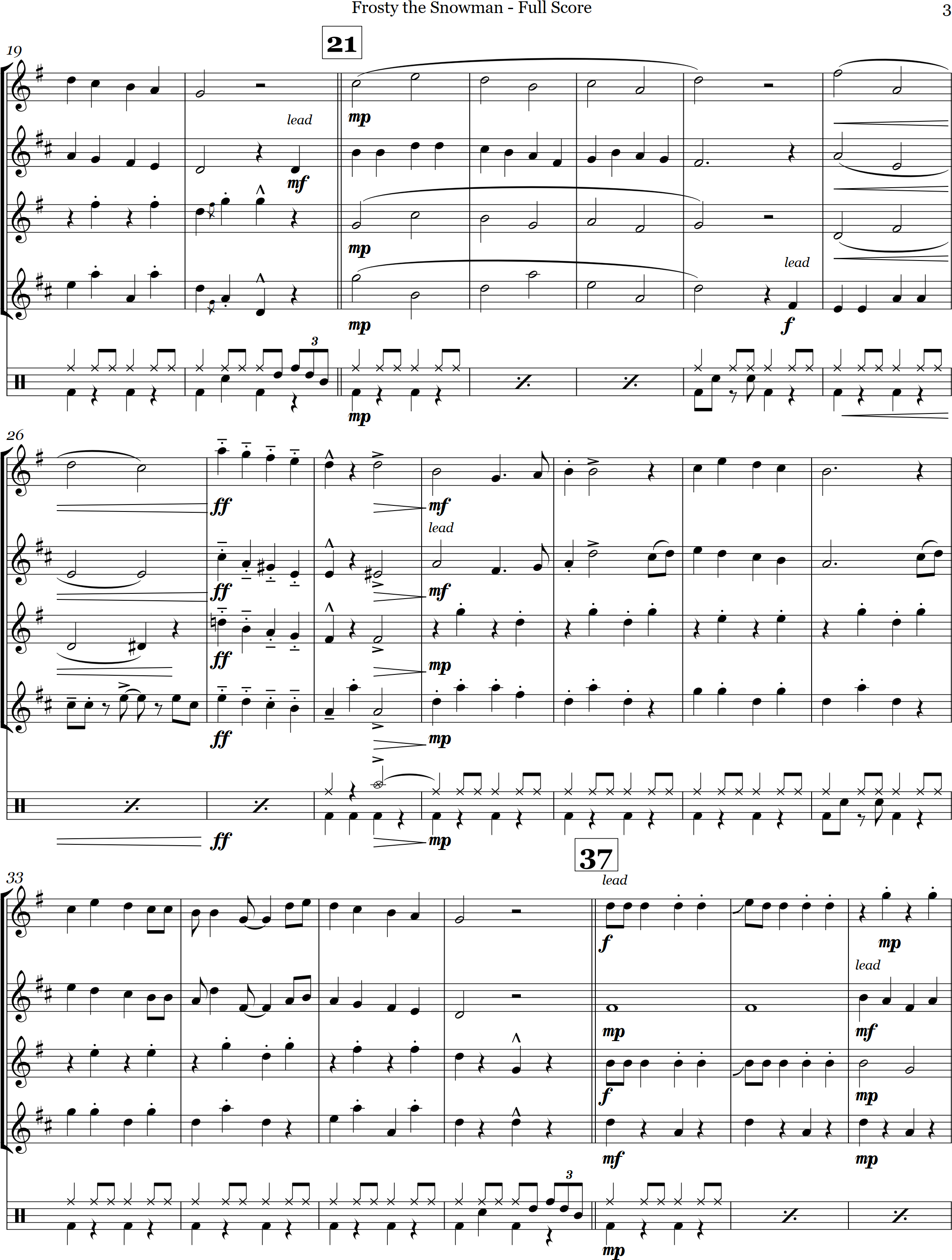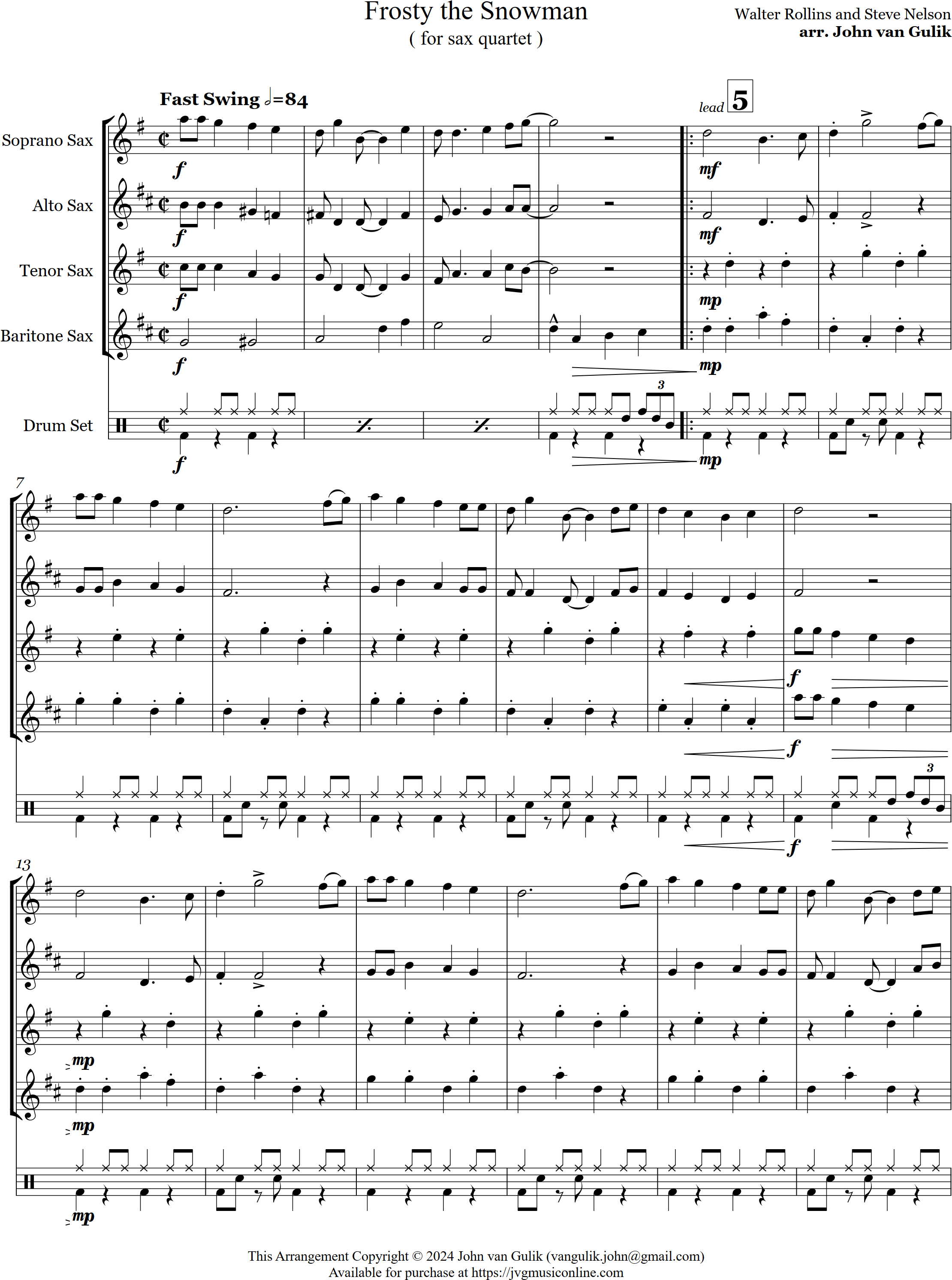 Frosty the Snowman | swing | Intermediate | F | A great holiday favourite for the kids, here's Frosty the Snowman arranged in a fast swing style for sax quartet and optional percussion | ||||