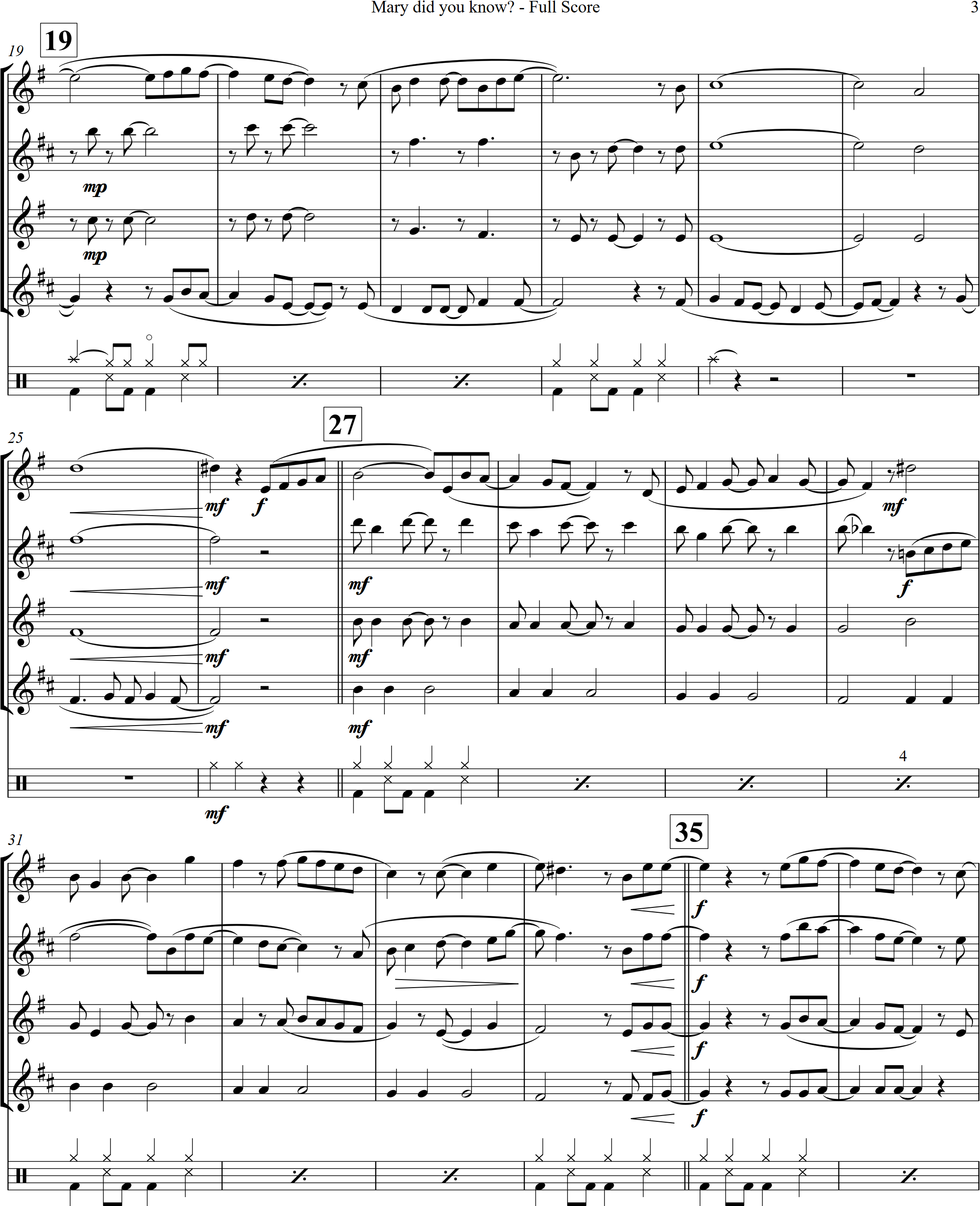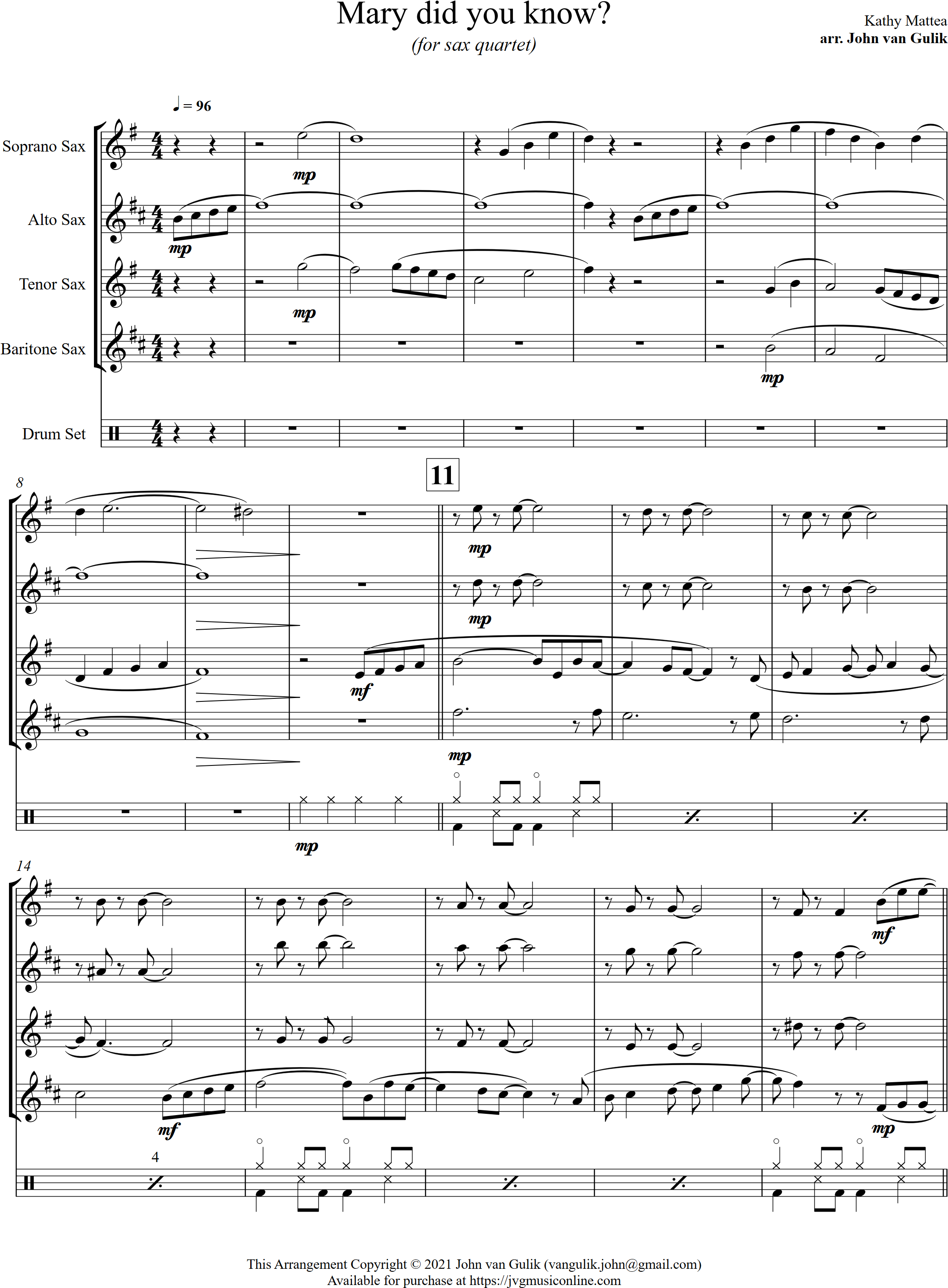 Mary Did You Know | ballad | Intermediate | F | WATCH | A beautiful song for Christmas, Mary Did You Know is tastefully arranged for 4 saxes and optional percussion. | |||