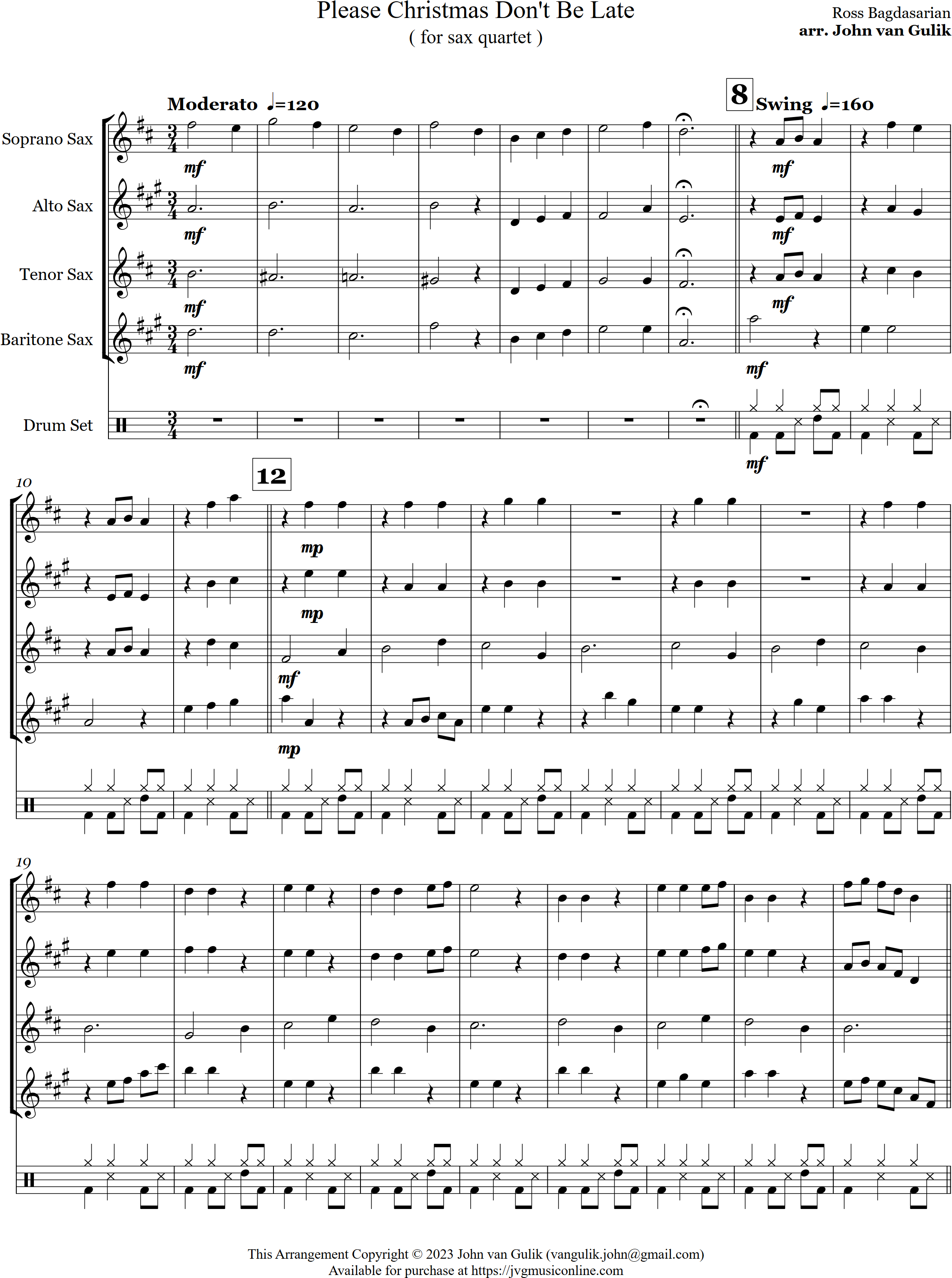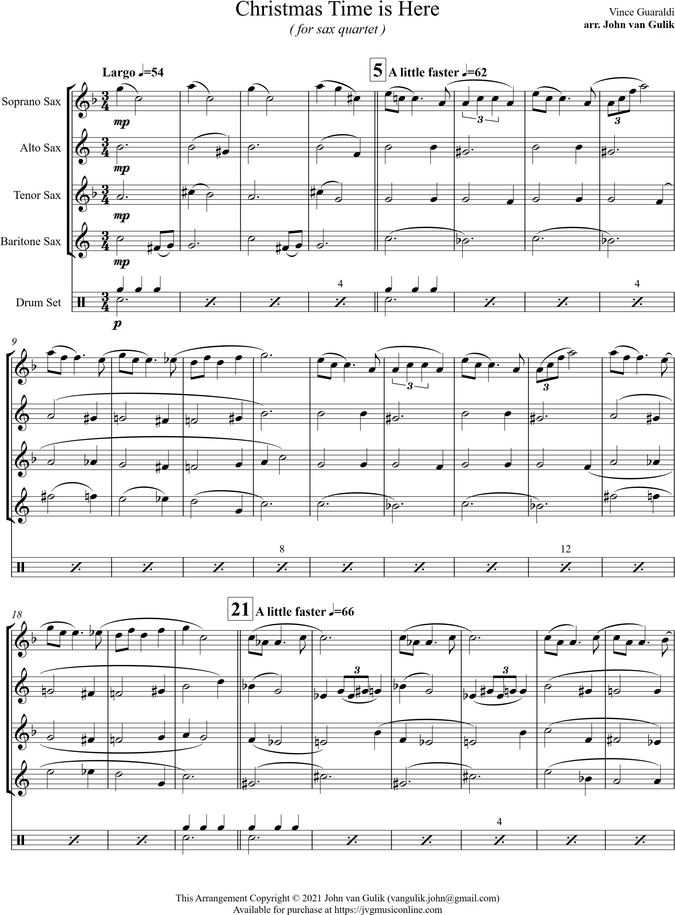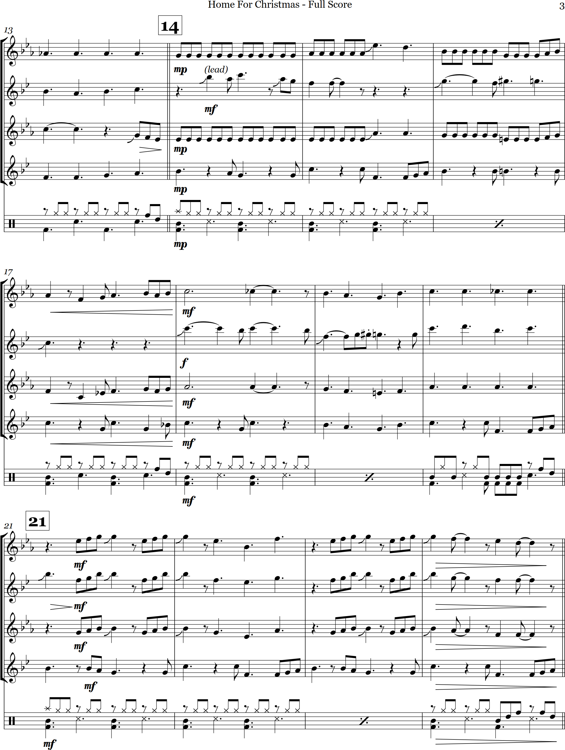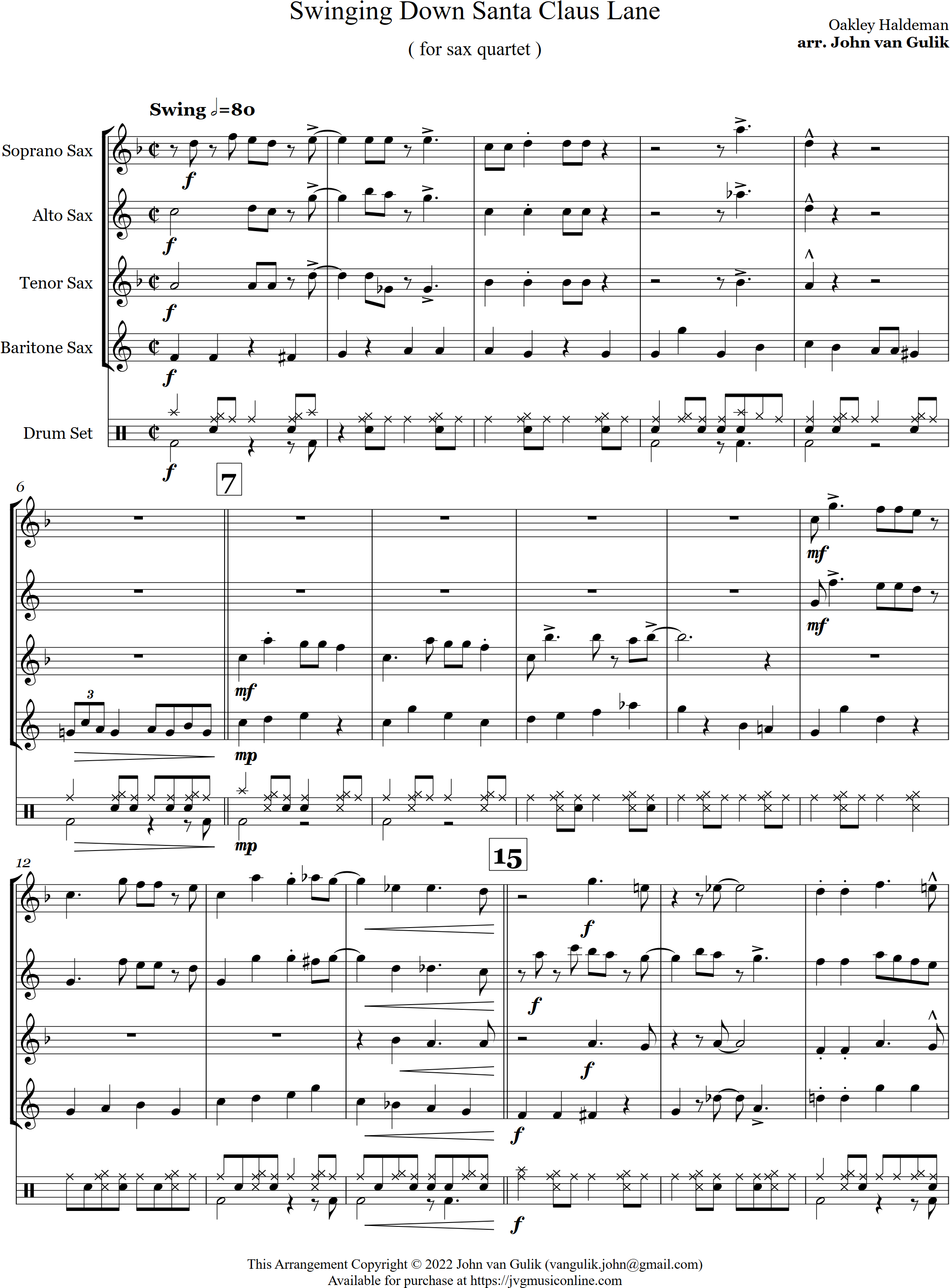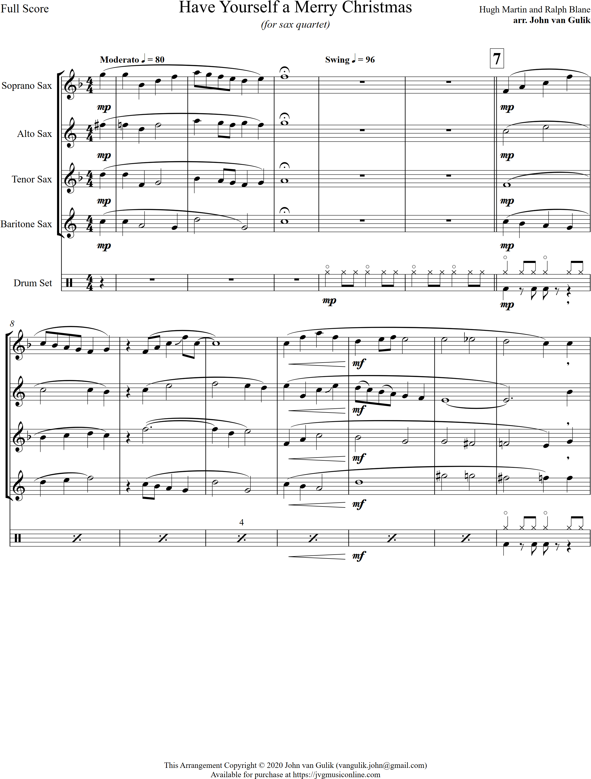 Have Yourself a Merry Christmas | swing | Intermediate | Eb | WATCH | Have Yourself a Merry Little Christmas is a swing style arrangement for 4 saxes and percussion. A favourite at Christmas, this is a great setting for a sax group. | |||