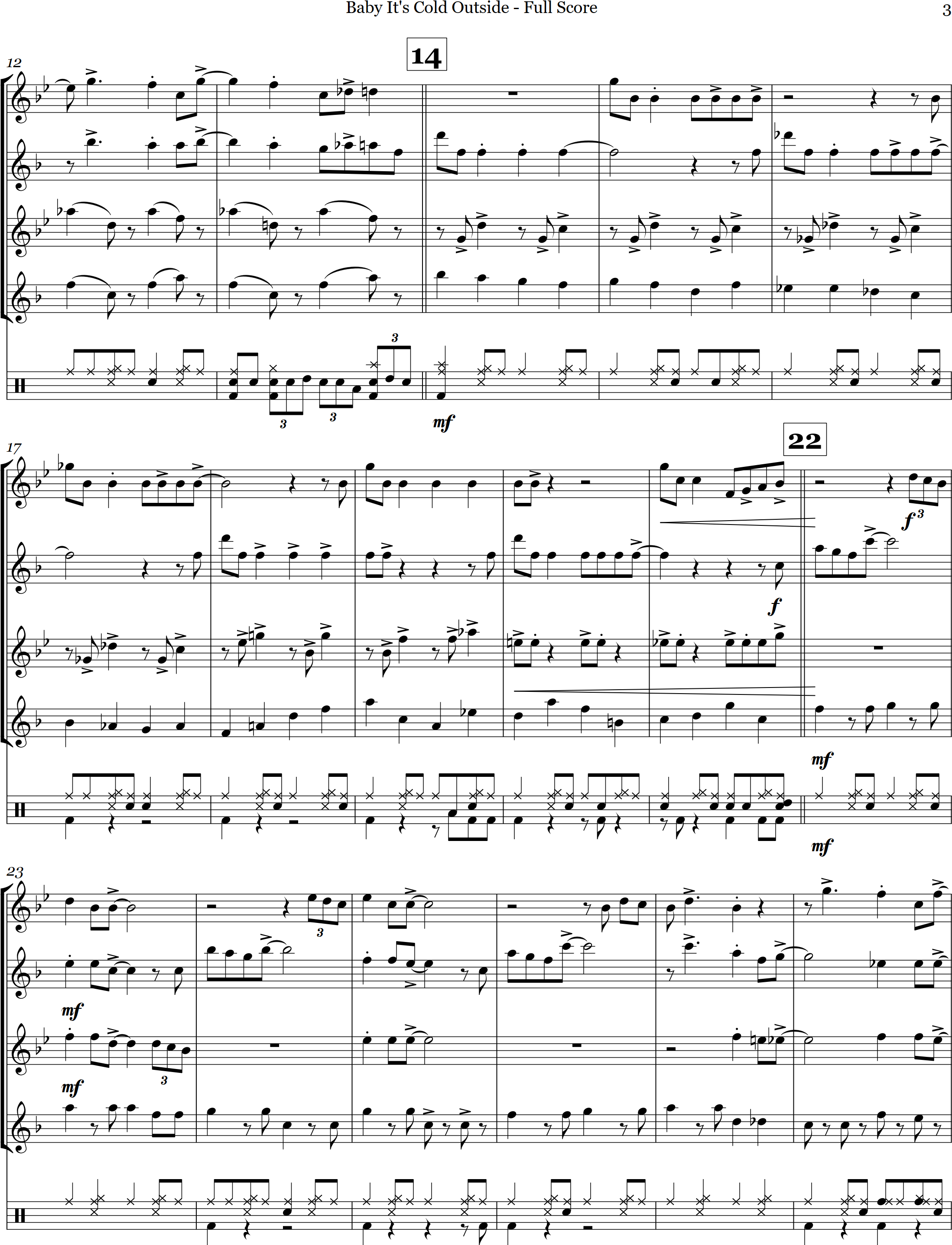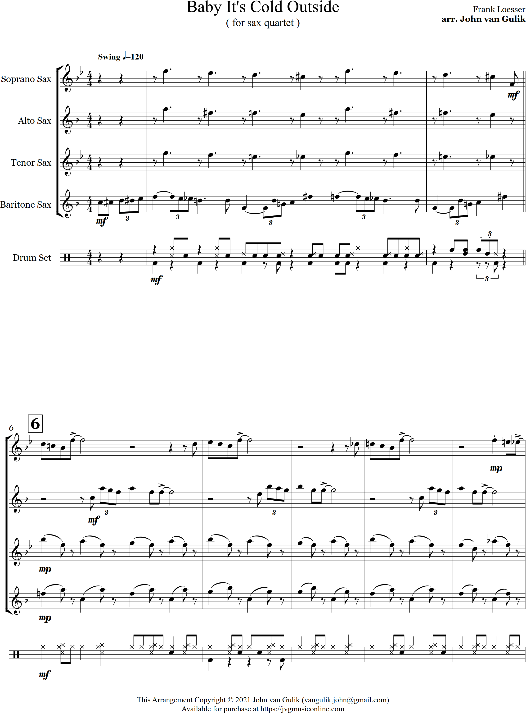 Baby It's Cold Outside | swing | Intermediate | Ab/Eb | A classic but controversial Christmas arrangement for 4 saxes plus optional percussion of the duet Baby It's Cold Outside. | ||||