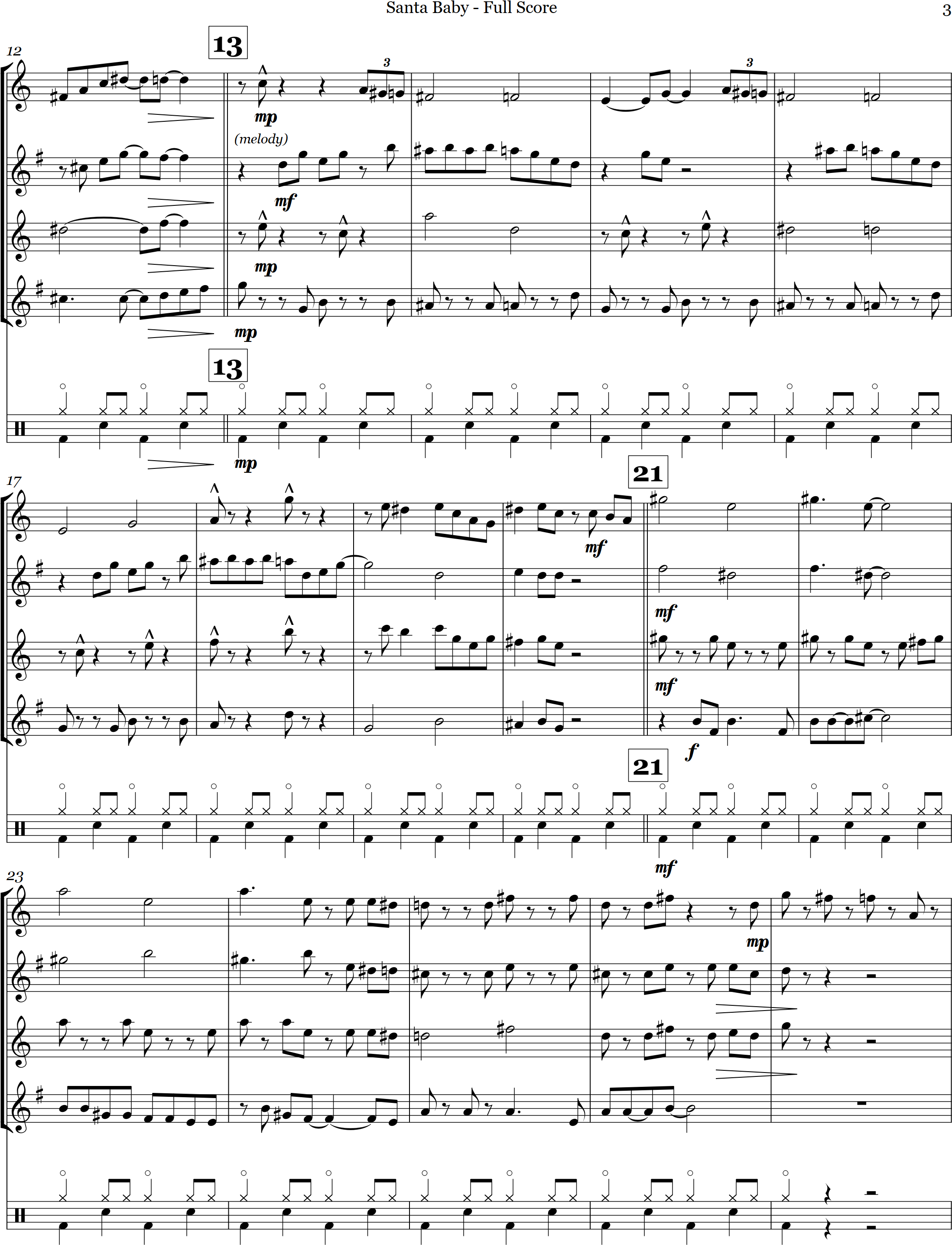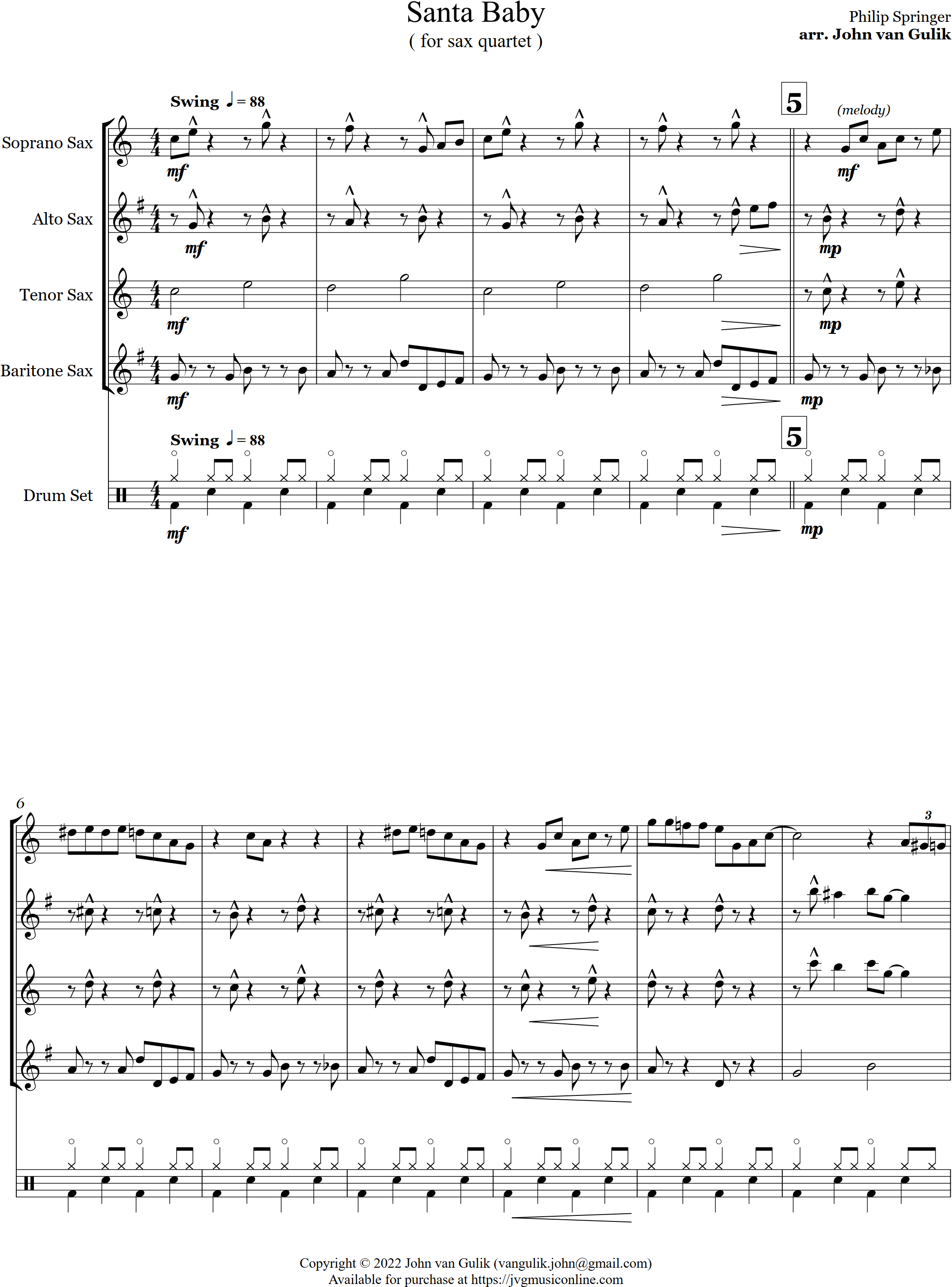 Santa Baby | swing | Intermediate | Bb/C | A great swing arrangement of the Christmas piece Santa Baby for 4 saxes and percussion. | ||||