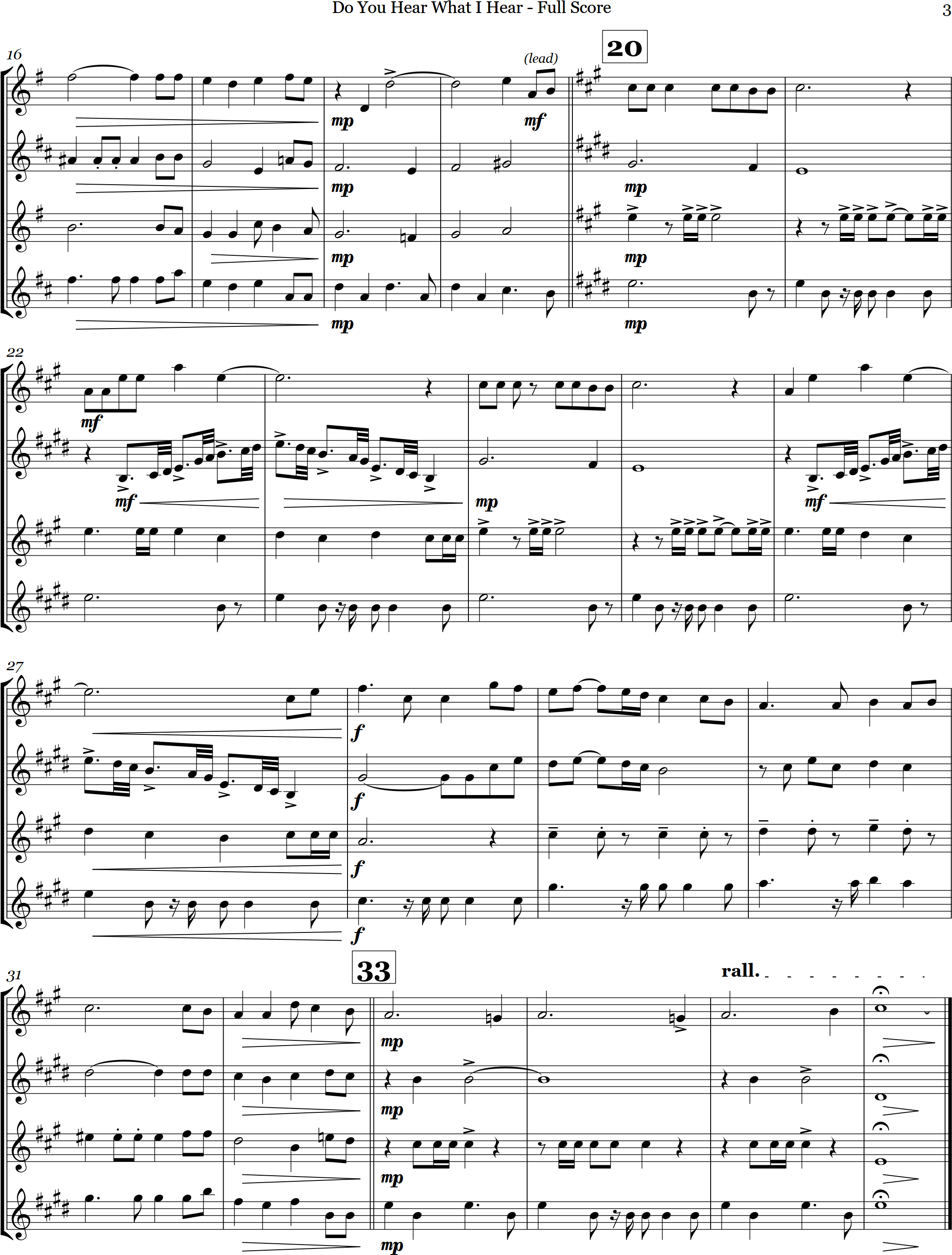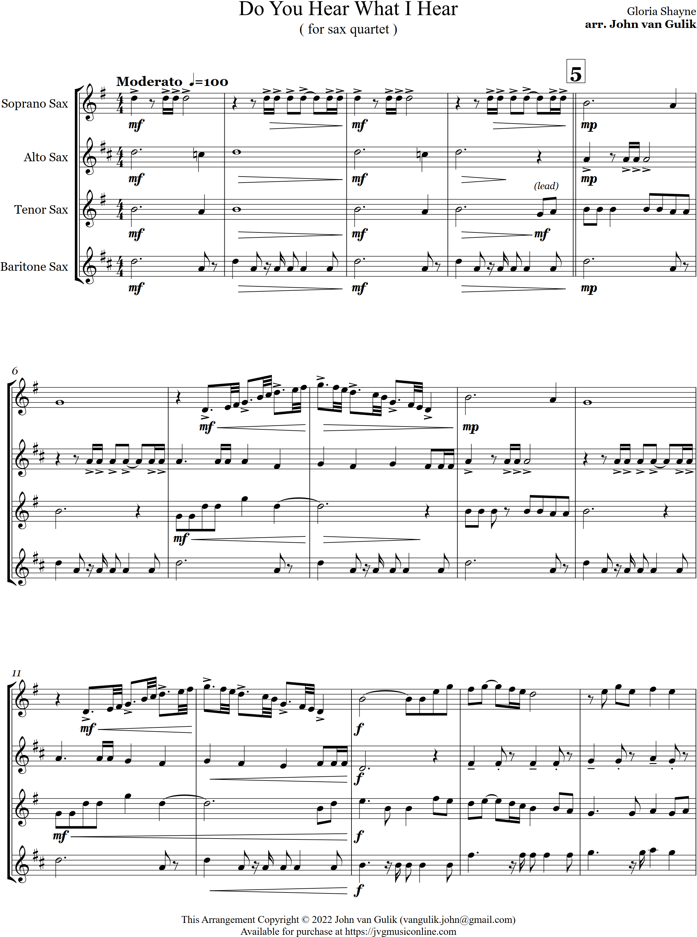 Do You Hear What I Hear | ballad | Intermediate | F/G | A Christmas classic, Do You Hear What I Hear is arranged here for 4 saxes in a unique 4 part setting. | ||||