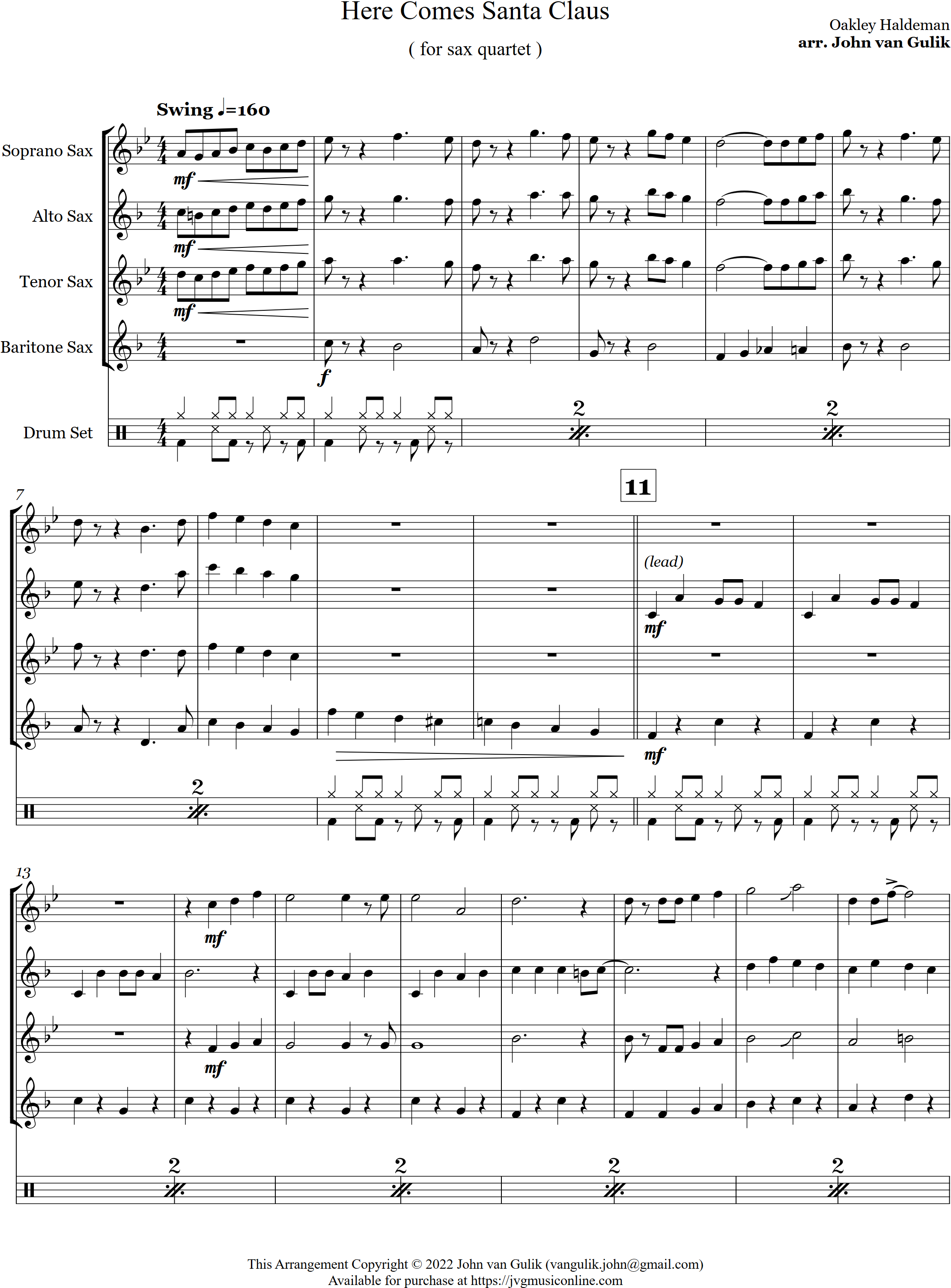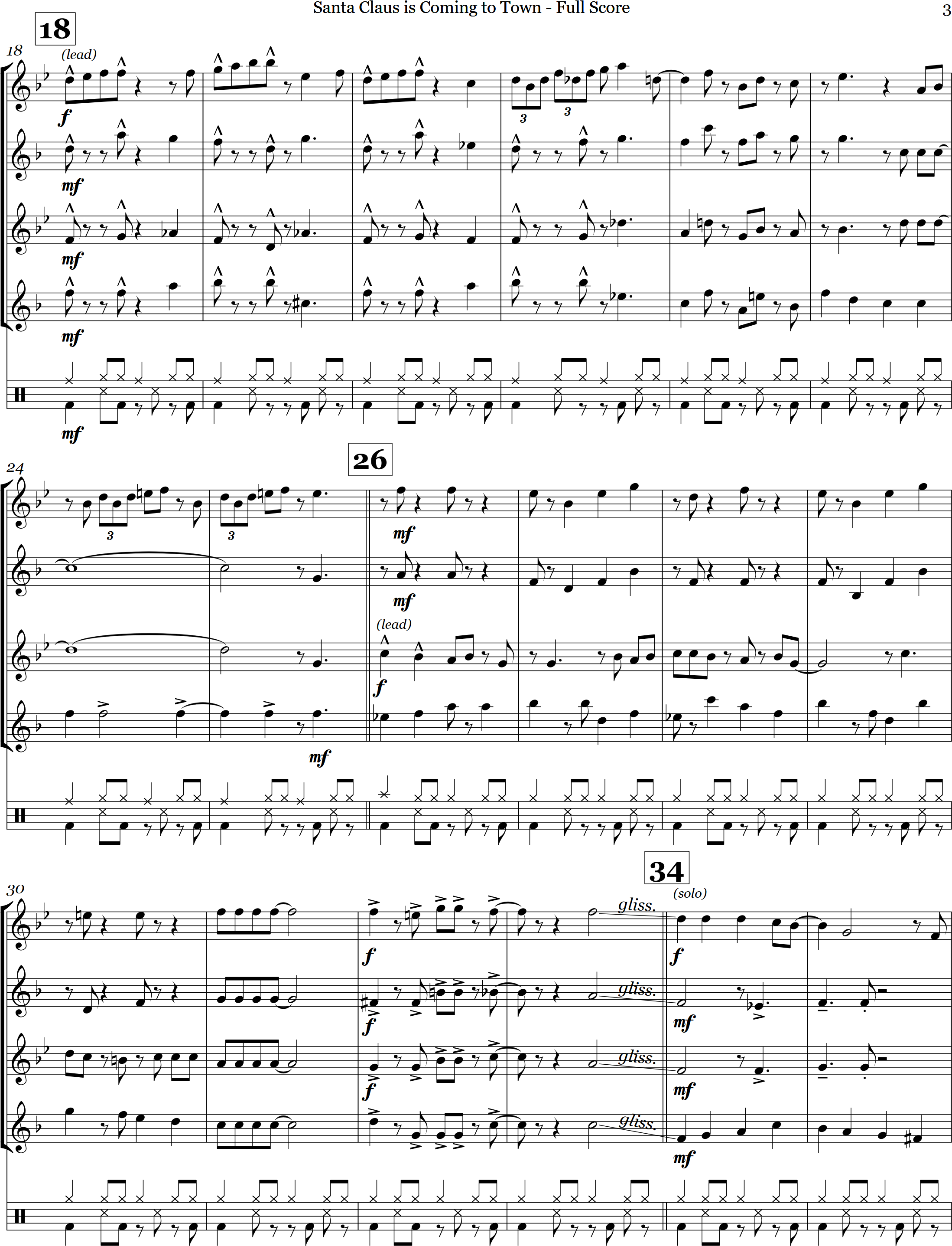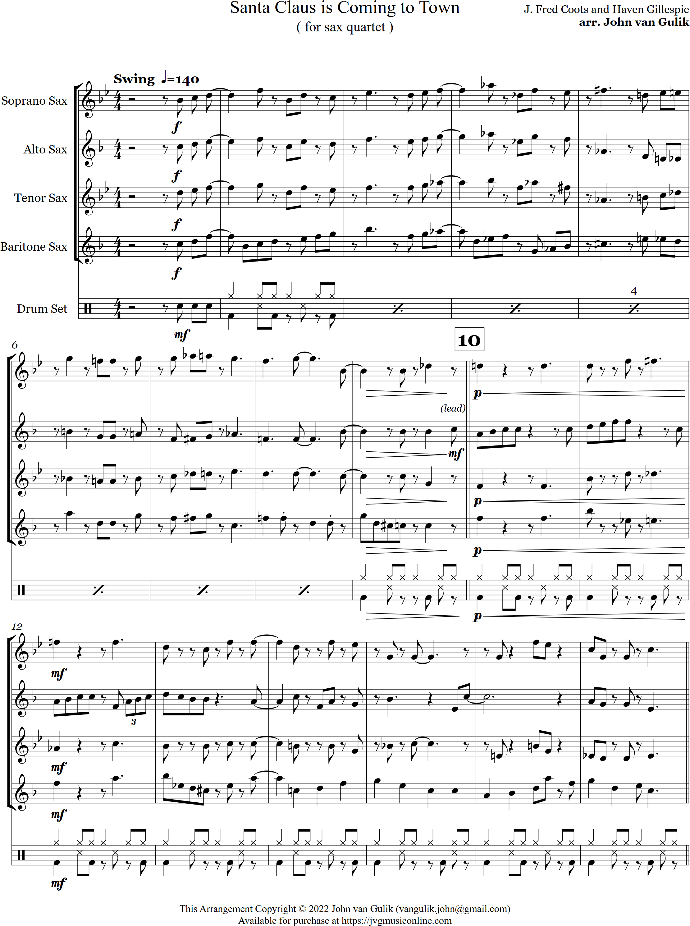 Santa Claus is Coming to Town | swing | Intermediate | Ab/Eb | Here's a new swing arrangement for Santa Claus is Coming to Town for 4 saxes and optional percussion | ||||