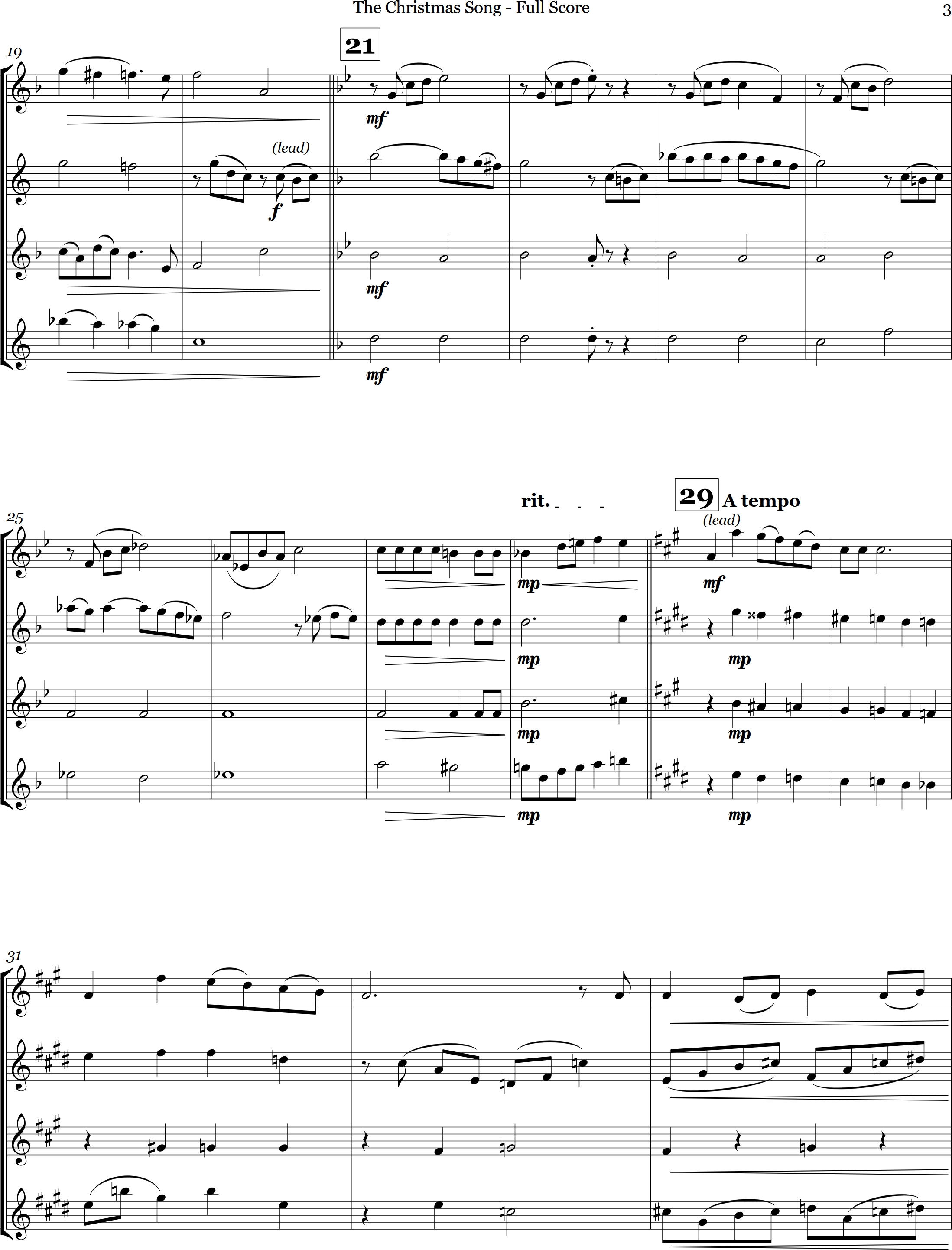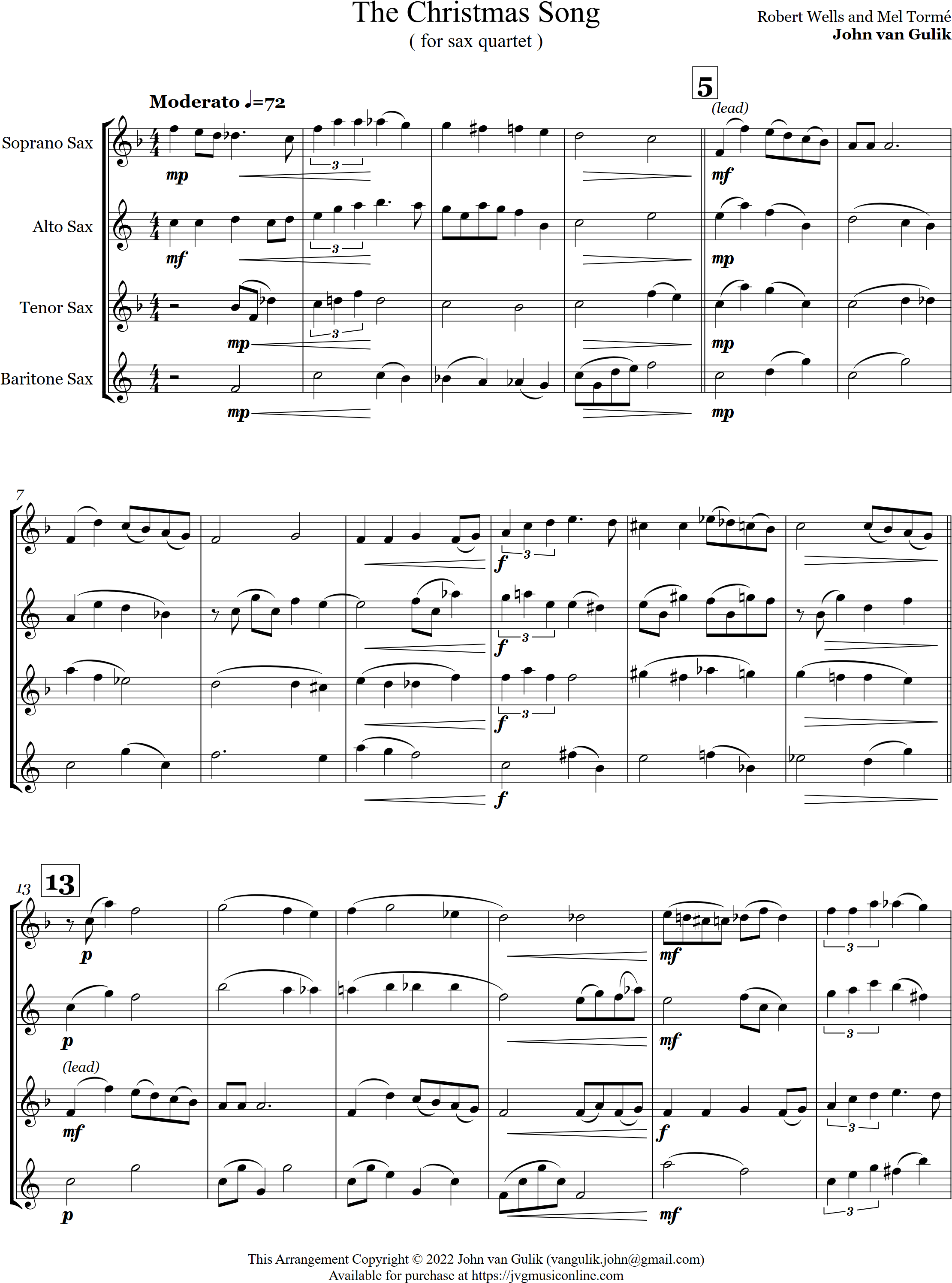 The Christmas Song | ballad | Intermediate | Eb/Ab/G | An old chestnut, The Christmas Song is arranged here for 4 saxes | ||||