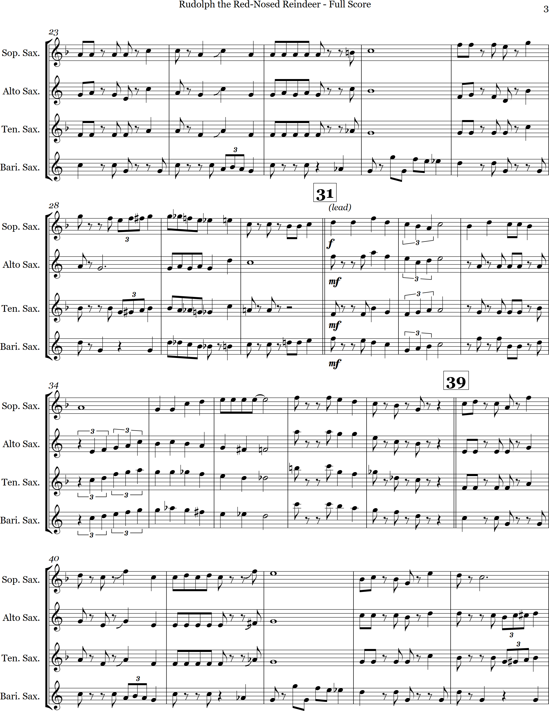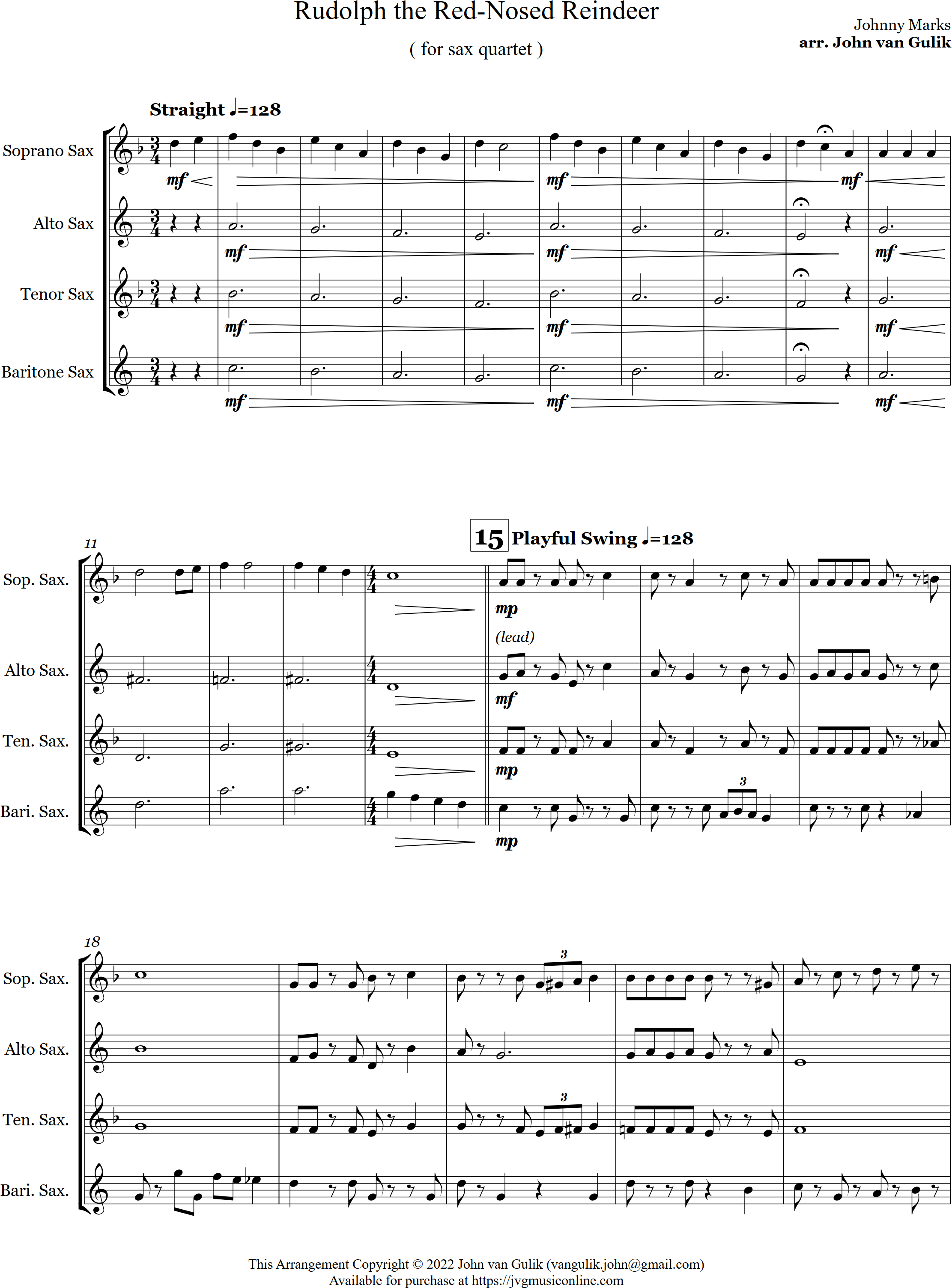 Rudolph the Red Nosed Reindeer | swing | Intermediate | Eb/Ab | A fun arrangement for 4 saxes of Rudolph the Red-Nosed Reindeer is sure to be a hit with the audience | ||||