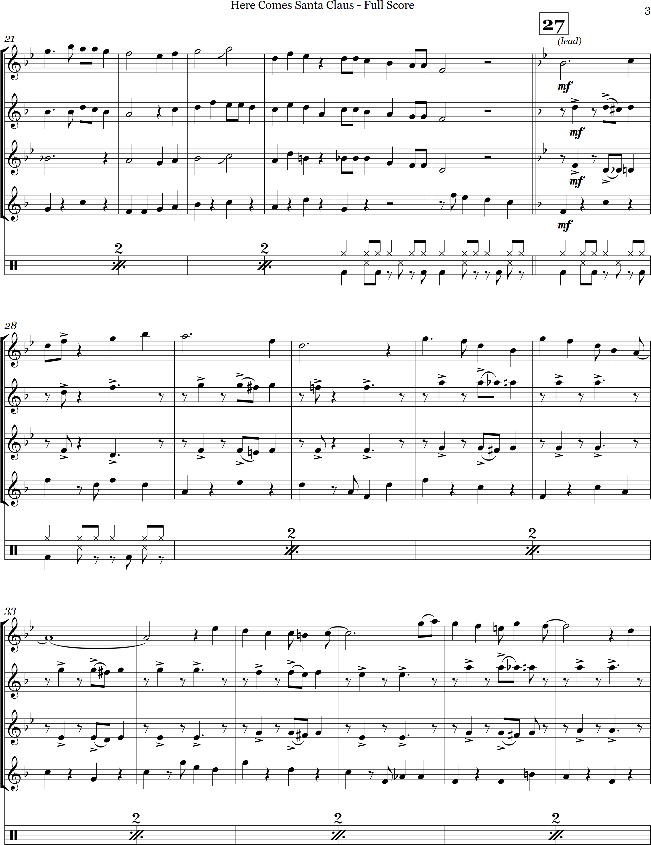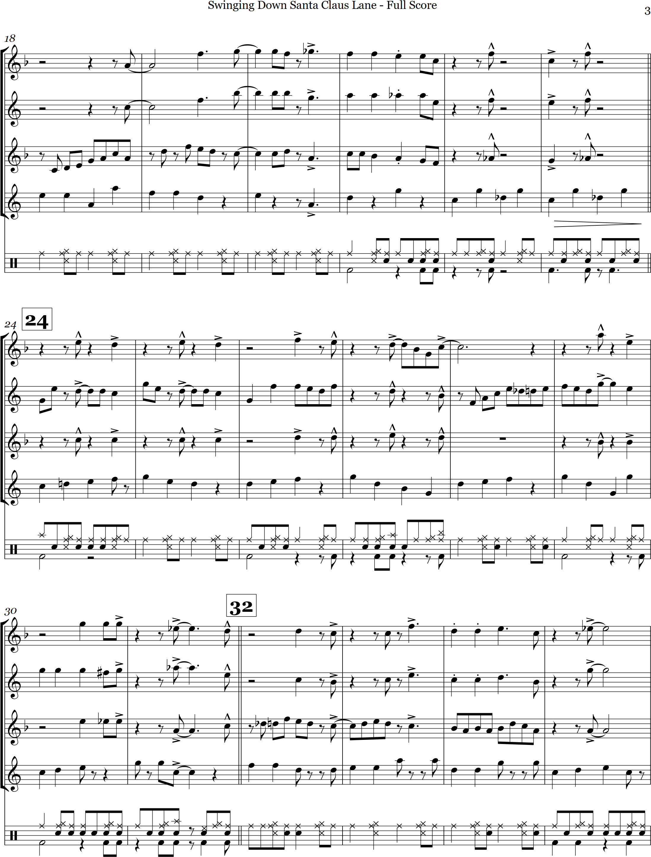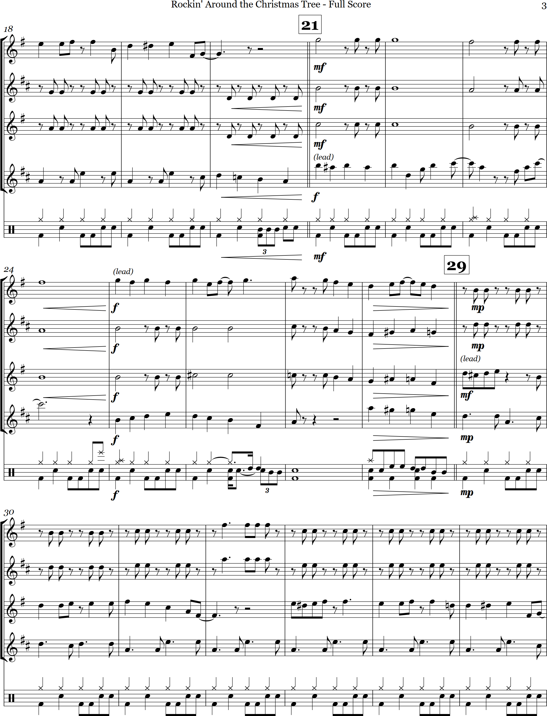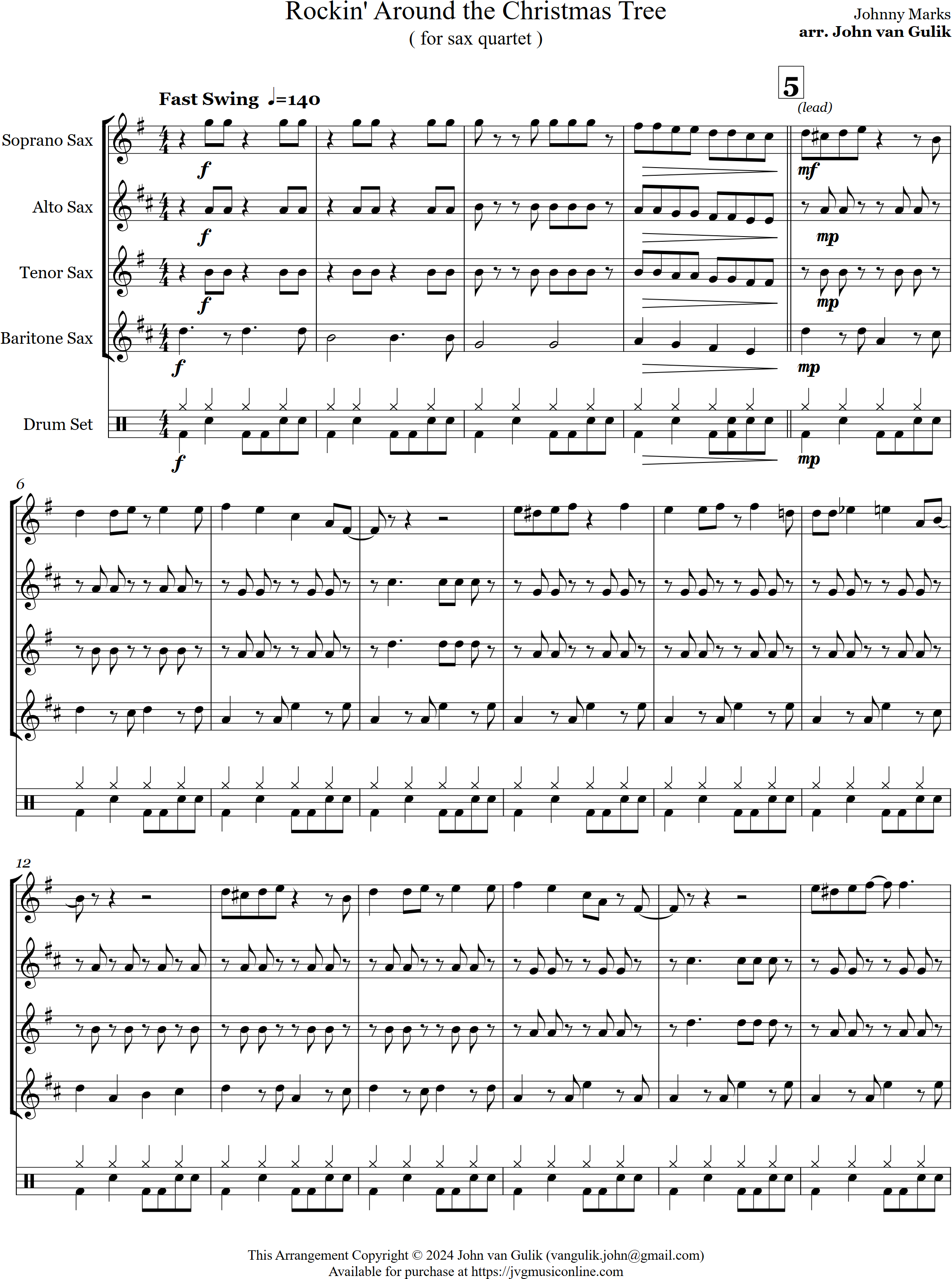 Rockin' around the Christmas Tree | swing | Intermediate | F | Rockin around the christmas tree is arranged here in a swing style for 4 saxes and percussion | ||||