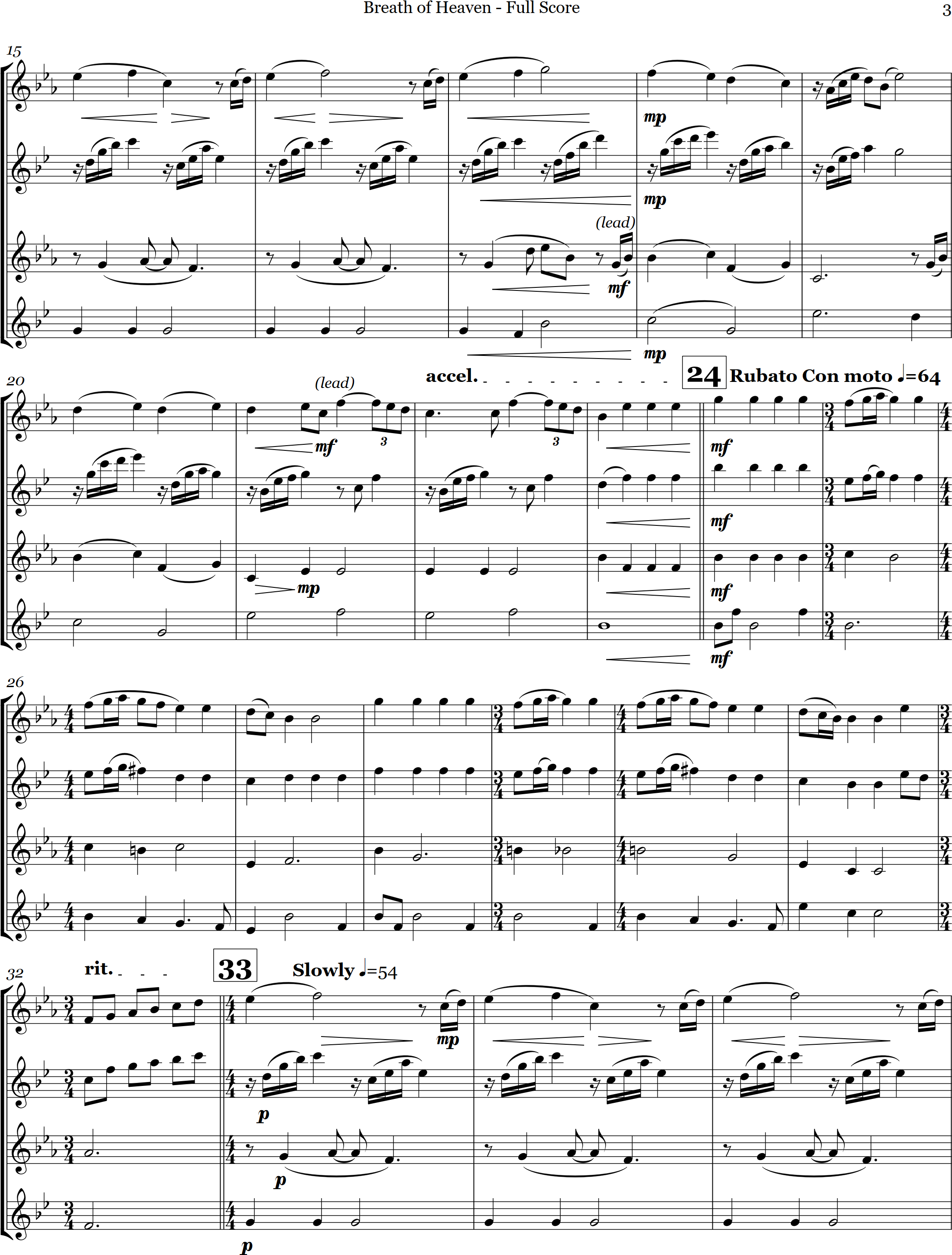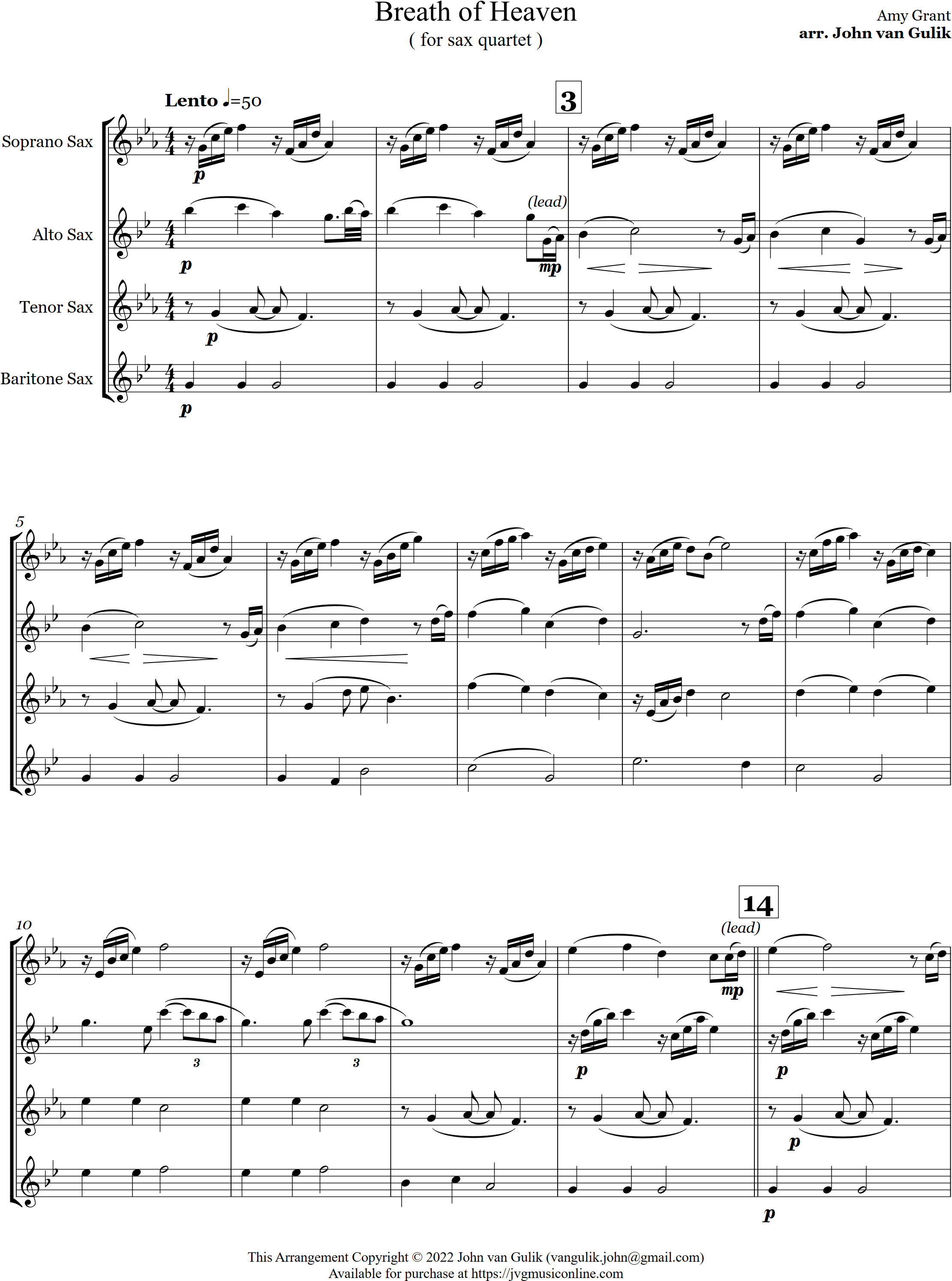 Breath of Heaven | ballad | Intermediate | Db | Breath of Heaven is arranged here in a lovely style for 4 saxes | ||||