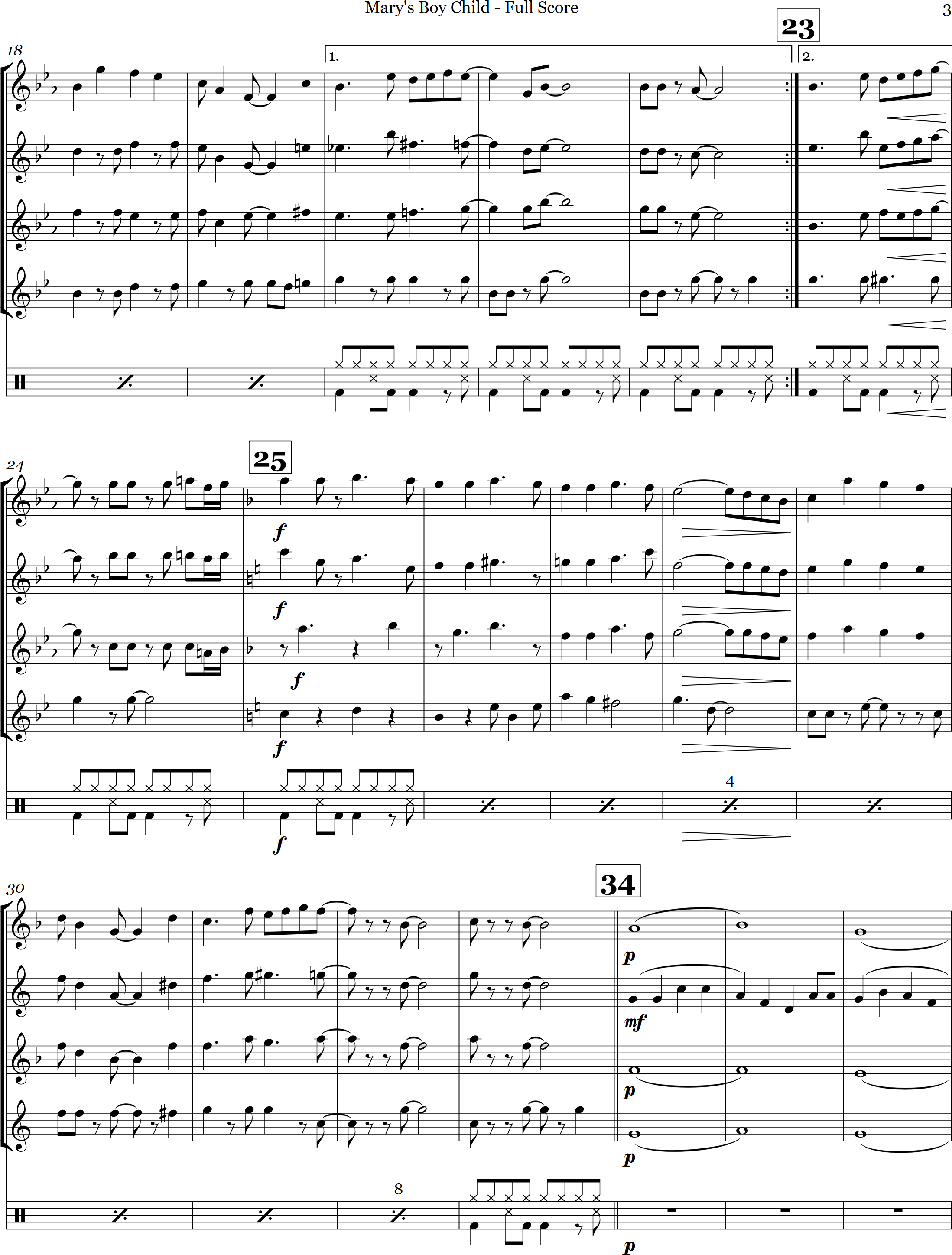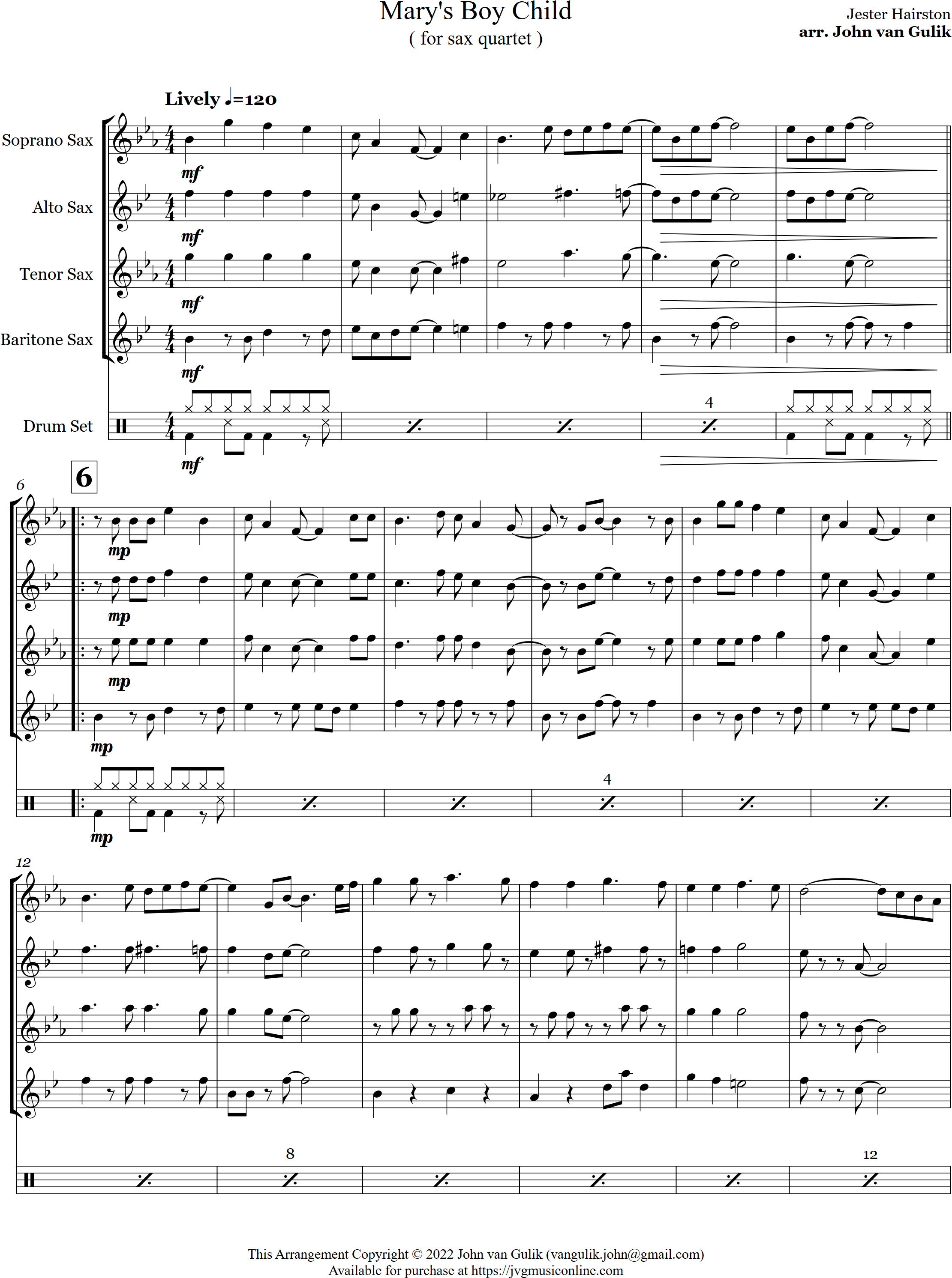 Mary's Boy Child | jazz | Intermediate | Db/Eb | A lively swing jazz style arrangement of Mary's Boy Child is arranged here for 4 saxes and optional percussion | ||||