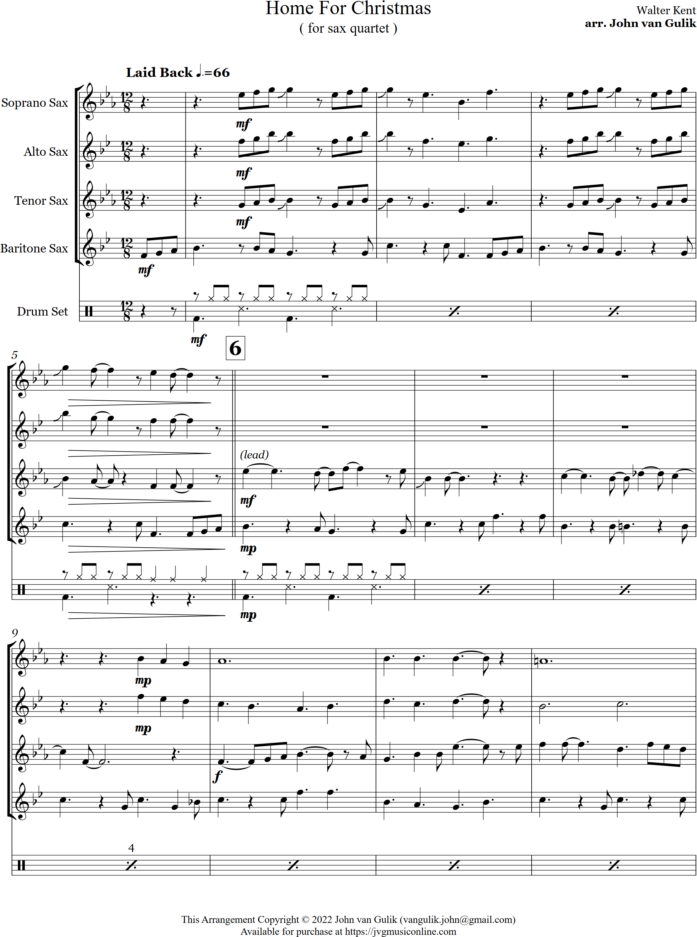 Home for Christmas | jazz | Intermediate | Db/Eb | A nice laid back rendition of I'll be Home for Christmas for 4 saxes and optional percussion. | ||||