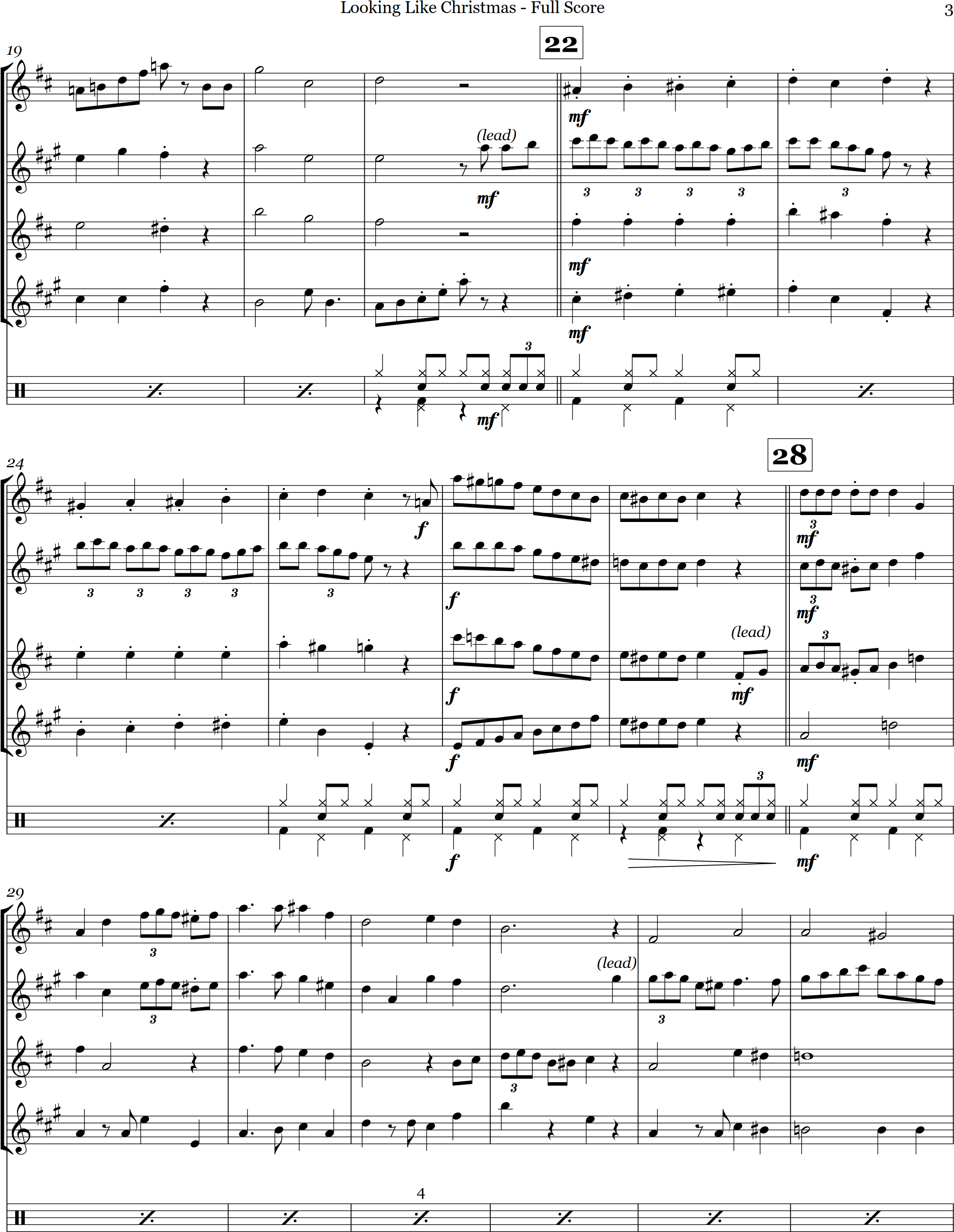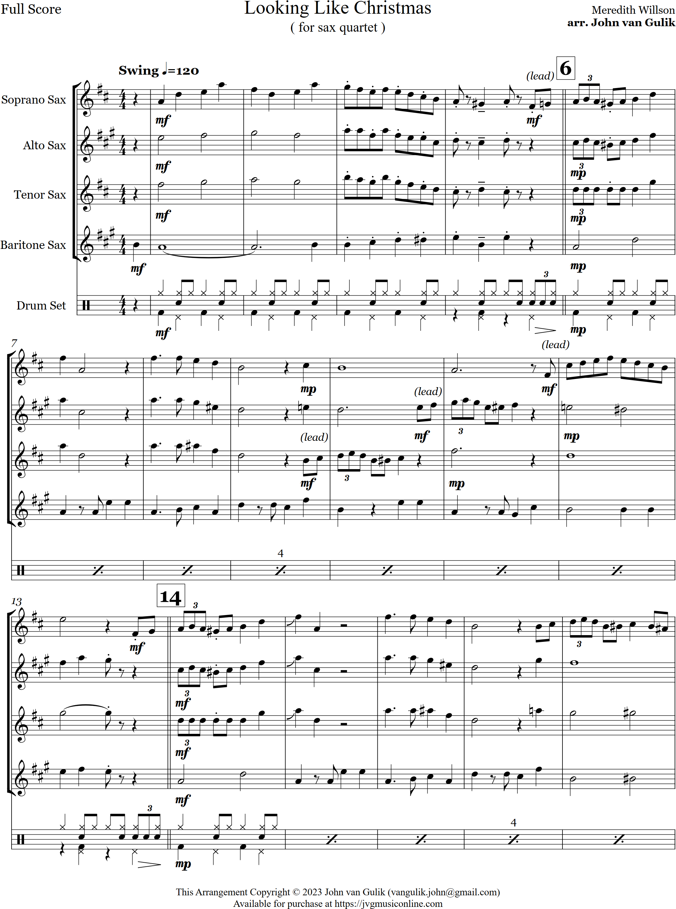 Looking Like Christmas | swing | Intermediate | C/Db | It's Beginning to Look a Lot Like Christmas is arranged here for 4 saxes and optional percussion. | ||||