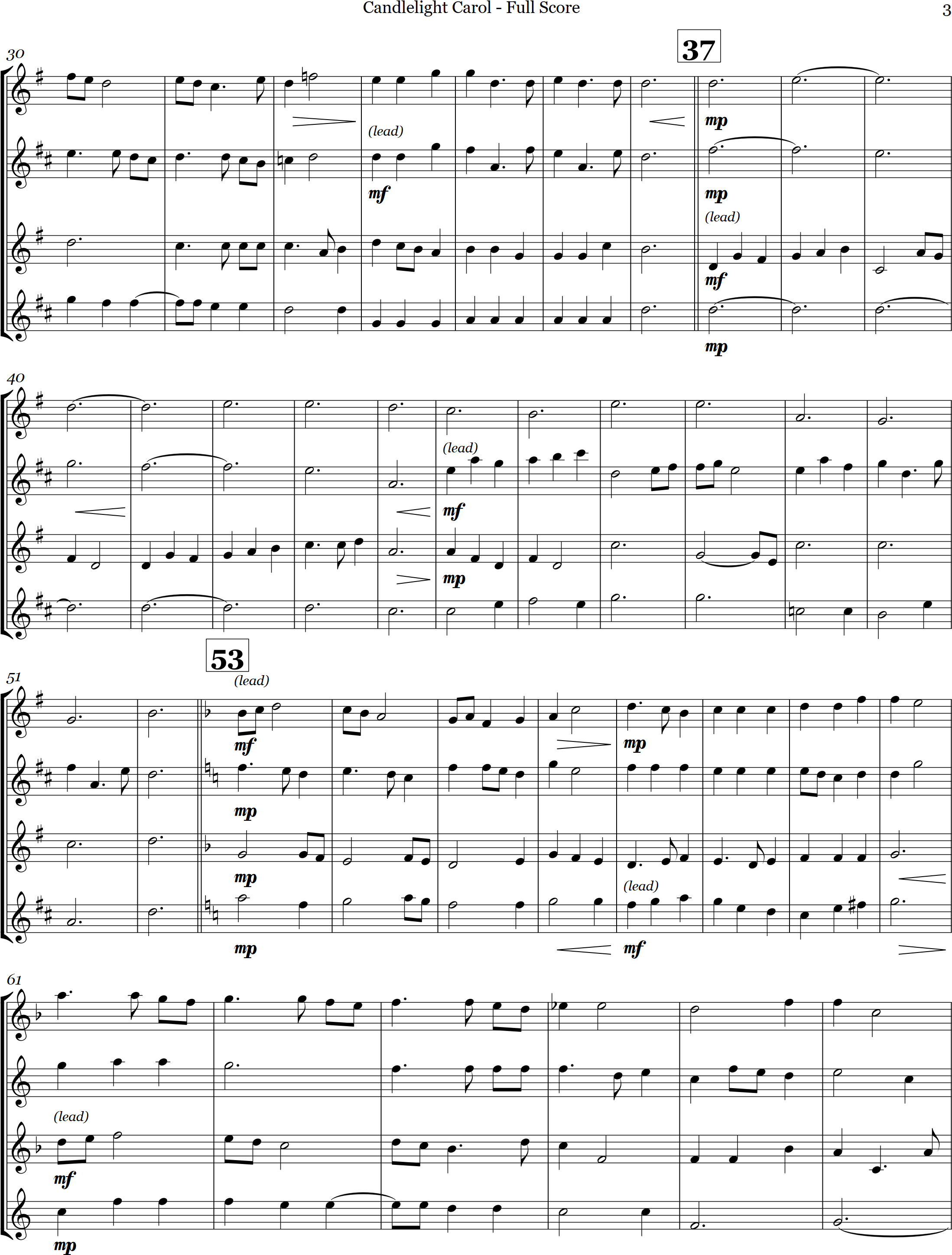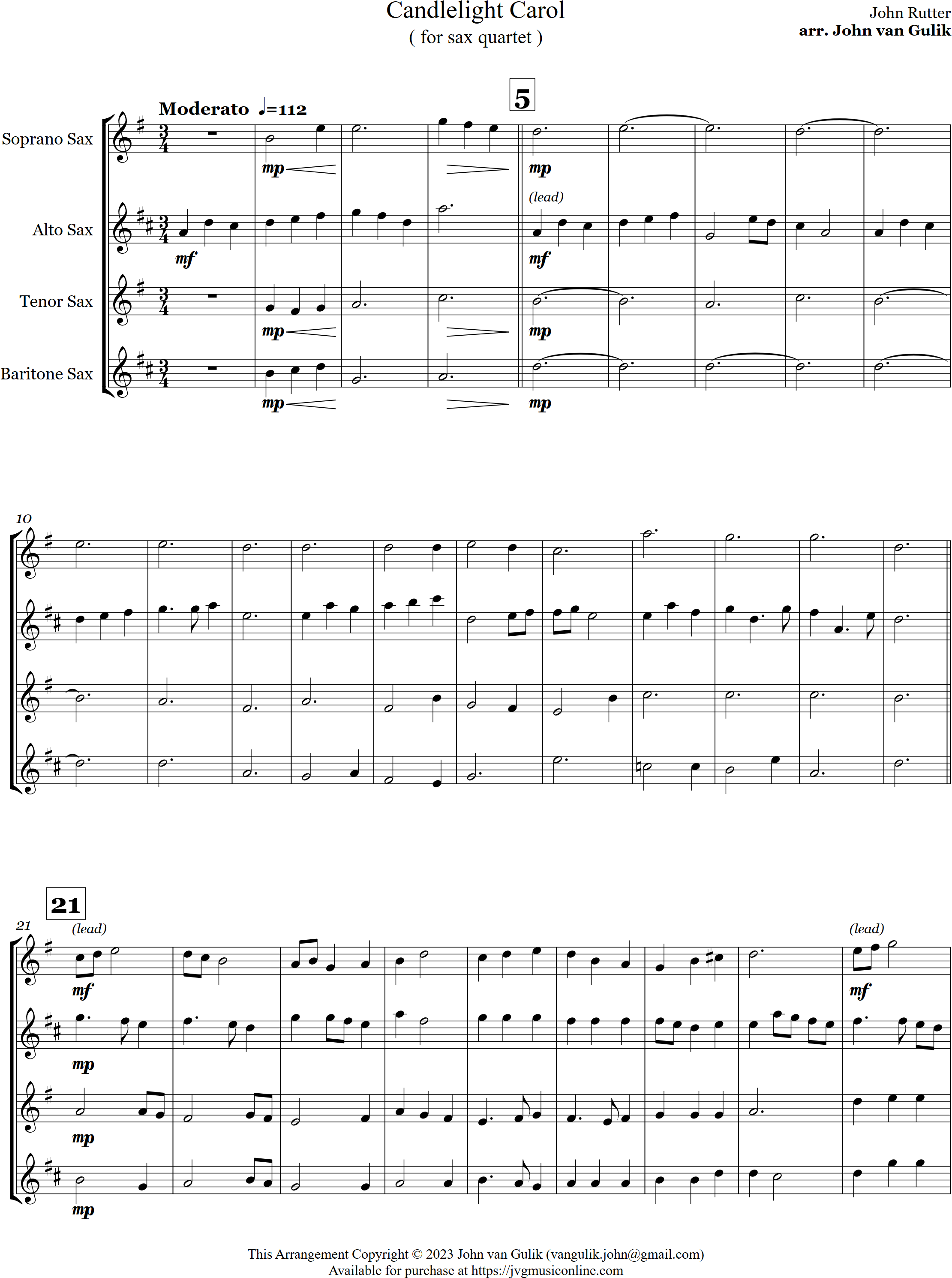 Candlelight Carol | carol | Intermediate | F/Eb | A lovely arrangement for 4 saxes of the Candlelight Carol | ||||