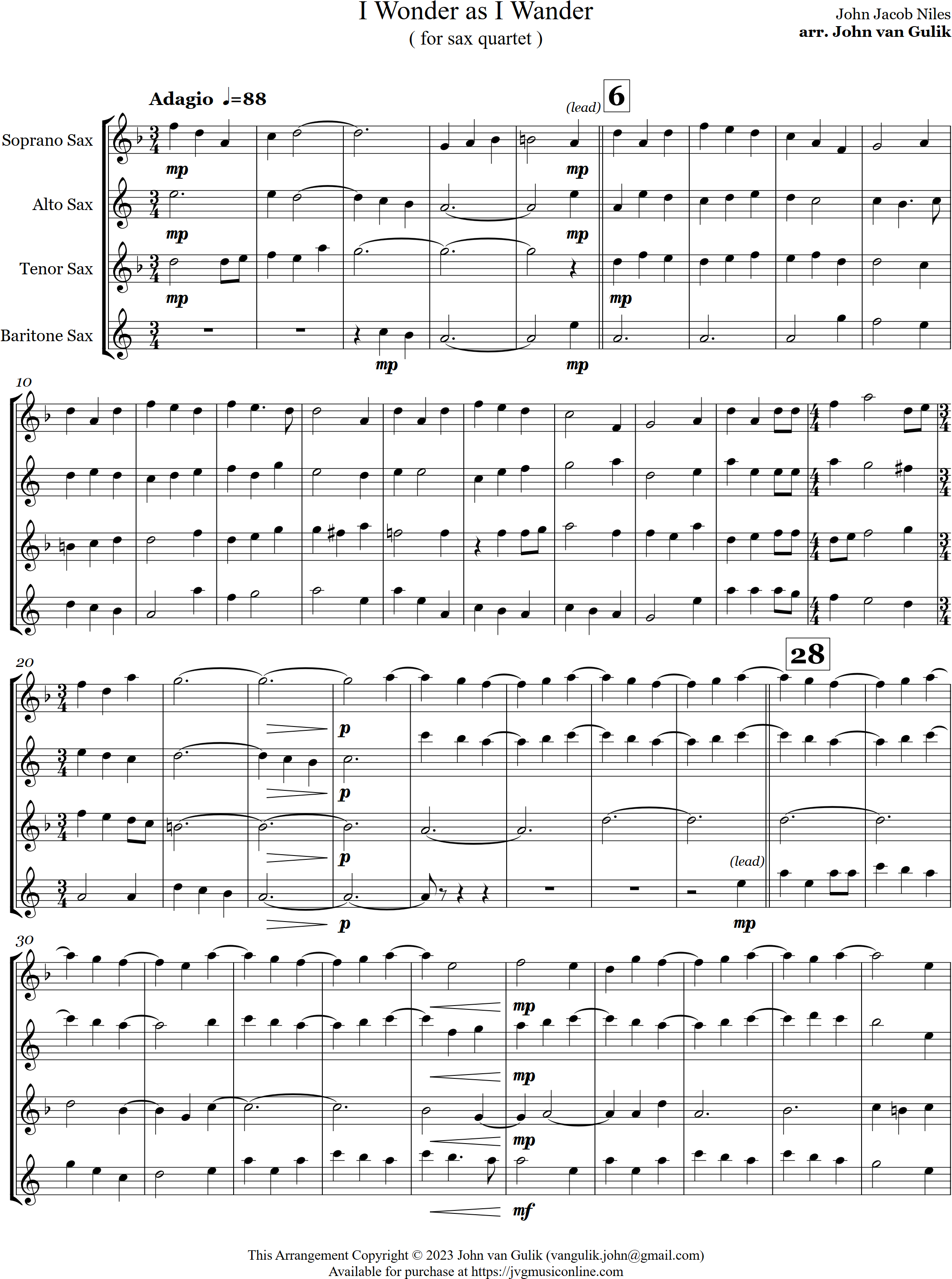 I Wonder As I Wander | carol | Intermediate | Eb | I Wonder as I Wander is arranged for 4 saxes. | ||||