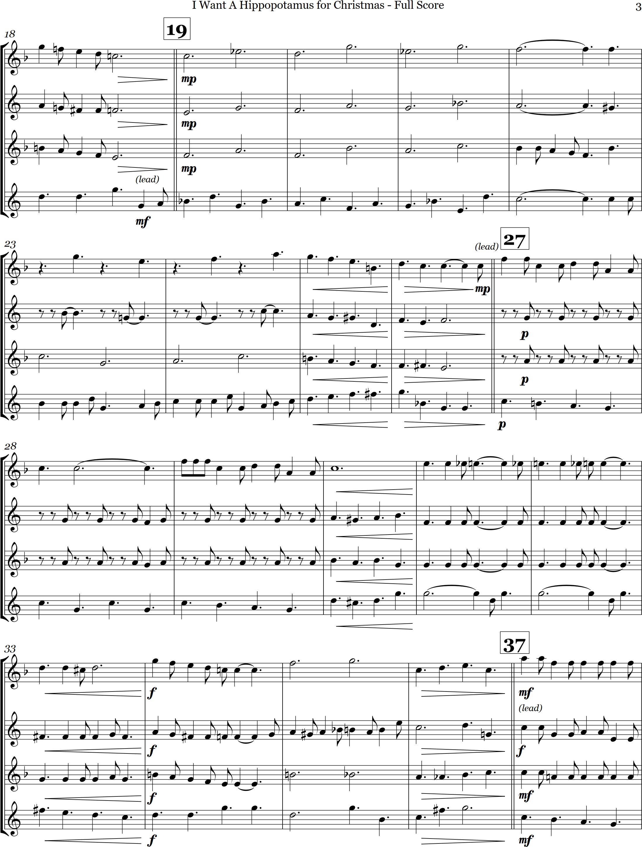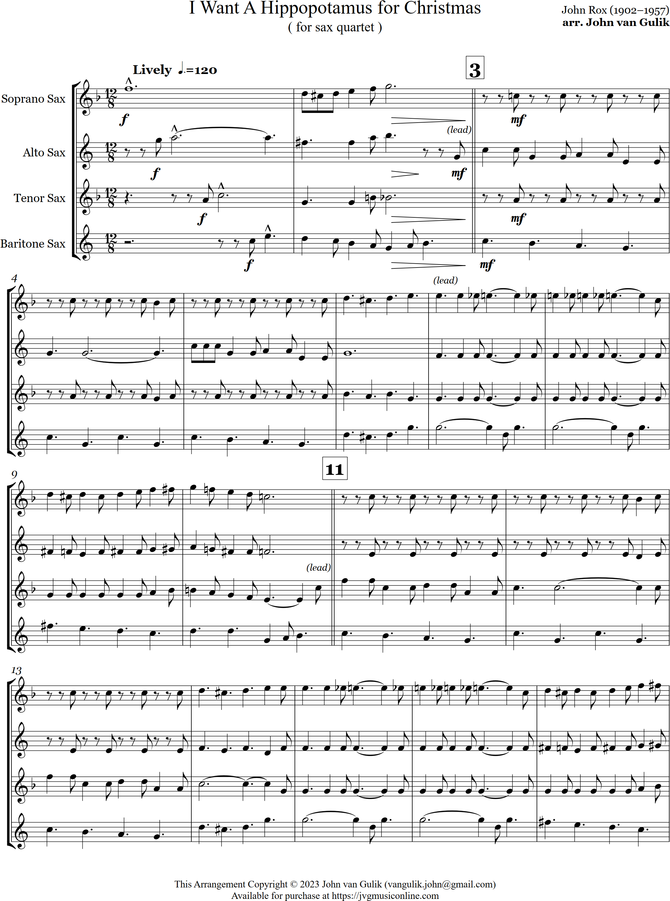 I Want a Hippopotamus for Christmas | swing | Intermediate | Eb | A wonderful children's classic, here is I Want a Hippopotamus for Christmas arranged for sax quartet | ||||