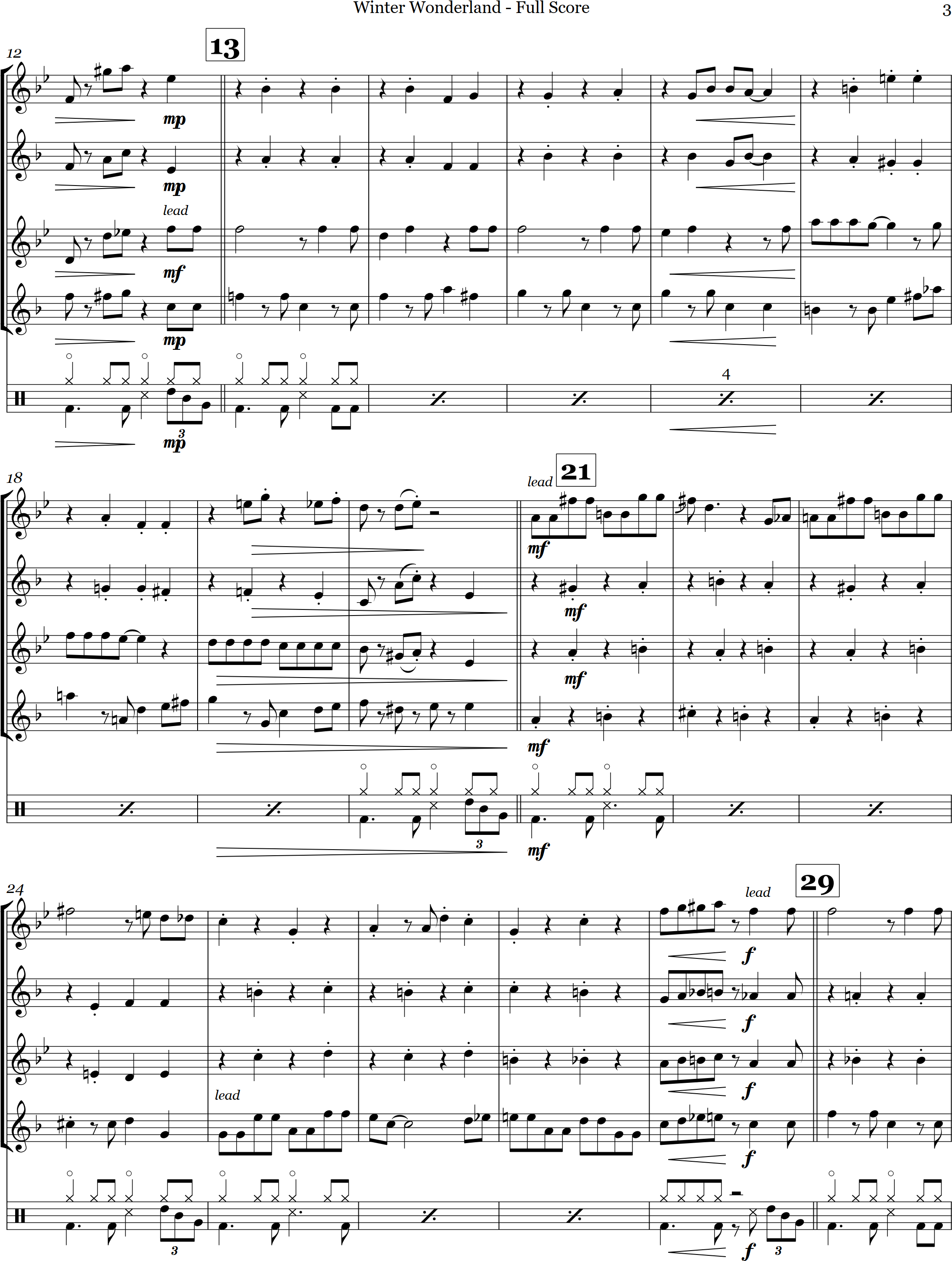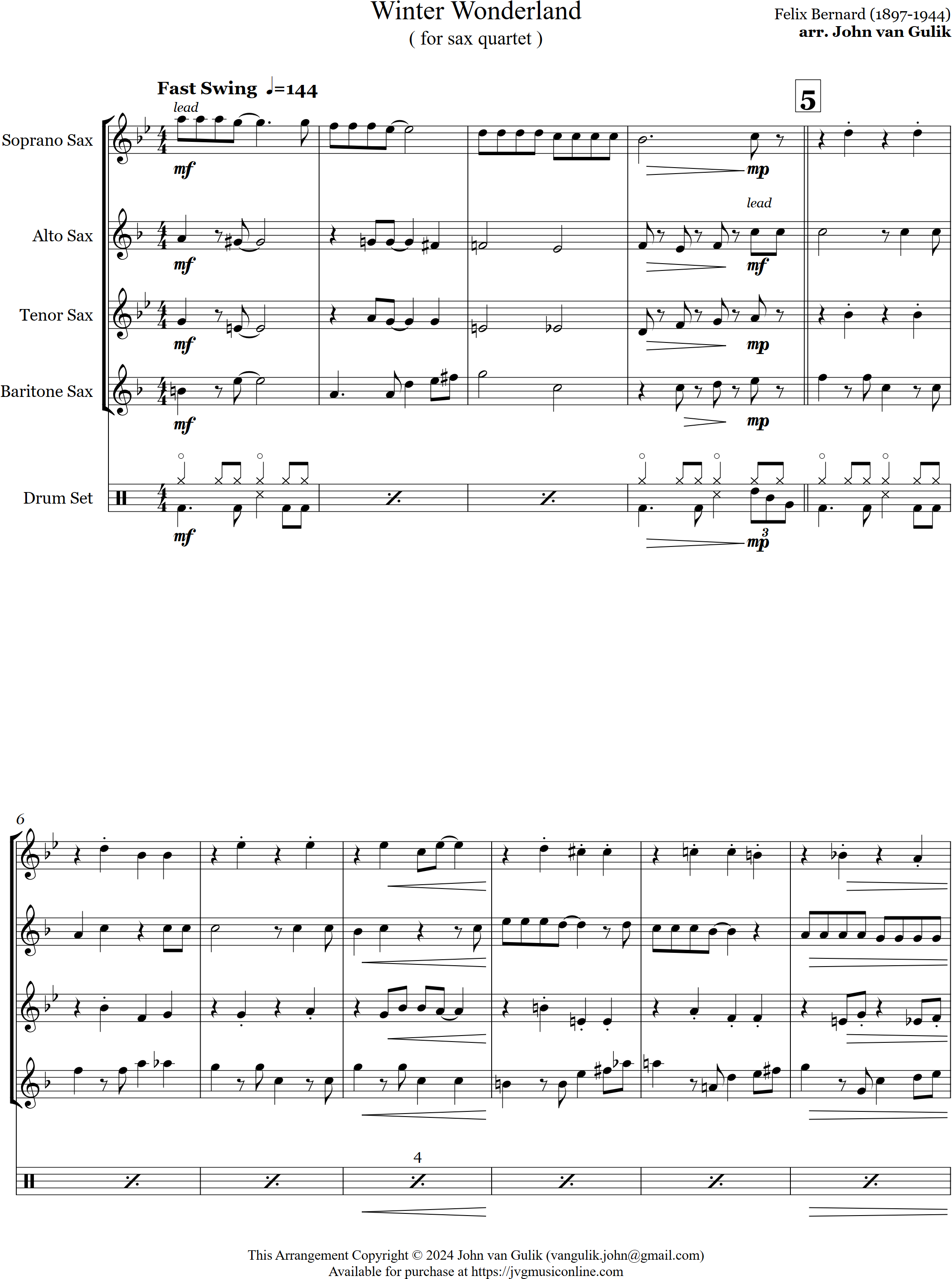 Winter Wonderland | swing | Intermediate | Ab/C/Eb/Ab | Swinging arrangement of Walkin' in a Winter Wonderland for sax quartet and optional percussion | ||||