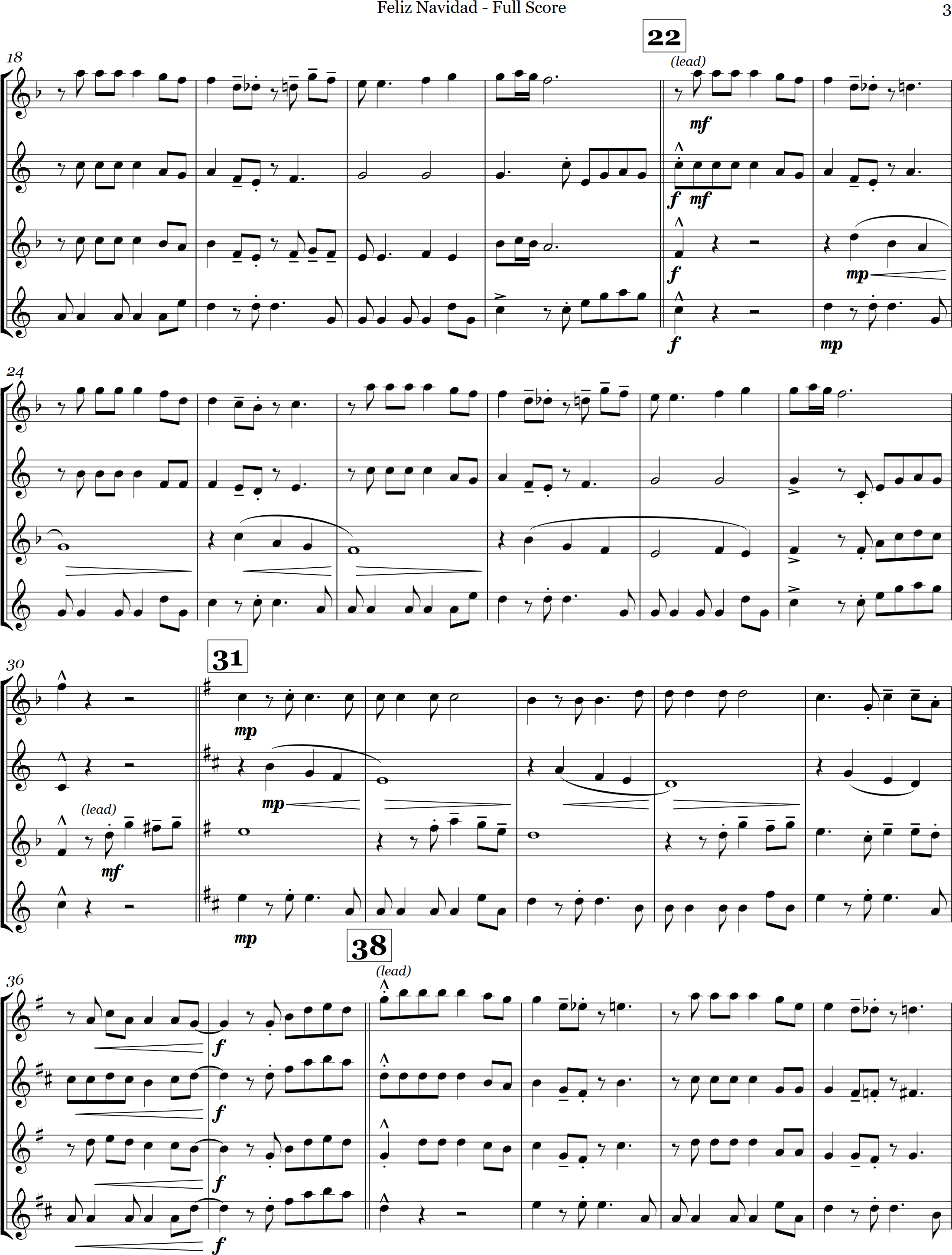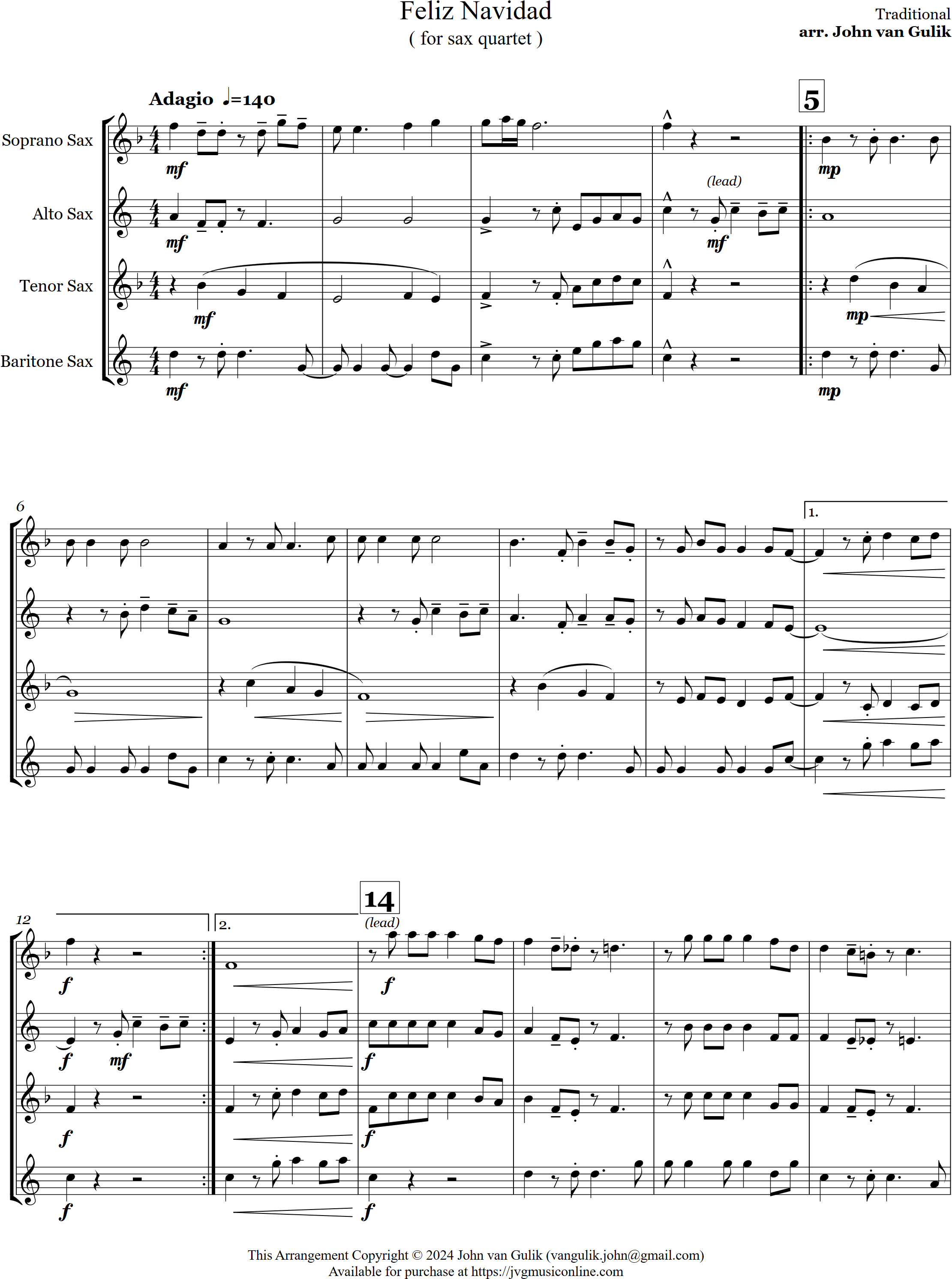 Feliz Navidad | traditional | Intermediate | Eb | Here's Feliz Navidad, a Christmas favourite concert piece arranged for sax quartet | ||||